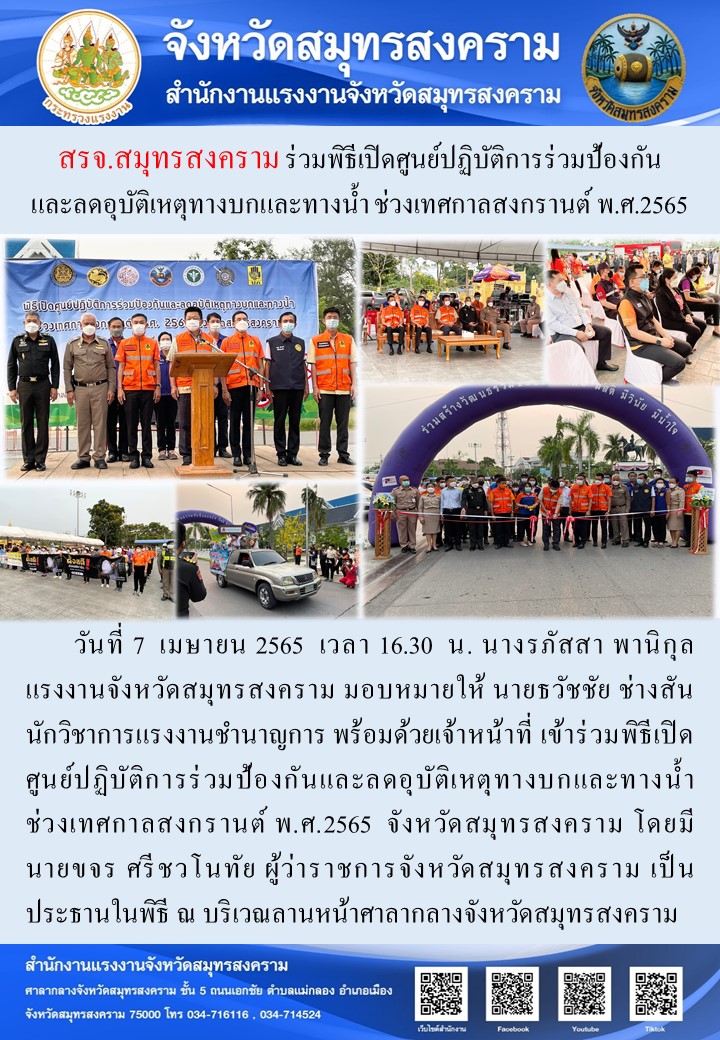 วันที่ 7 เมษายน 2565 เวลา 16.30 น. นางรภัสสา พานิกุล แรงงานจังหวัดสมุทรสงคราม มอบหมายให้ นายธวัชชัย ช่างสัน นักวิชาการแรงงานชำนาญการ พร้อมด้วยเจ้าหน้าที่ เข้าร่วมพิธีเปิดศูนย์ปฏิบัติการร่วมป้องกันและลดอุบัติเหตุทางบกและทางน้ำ