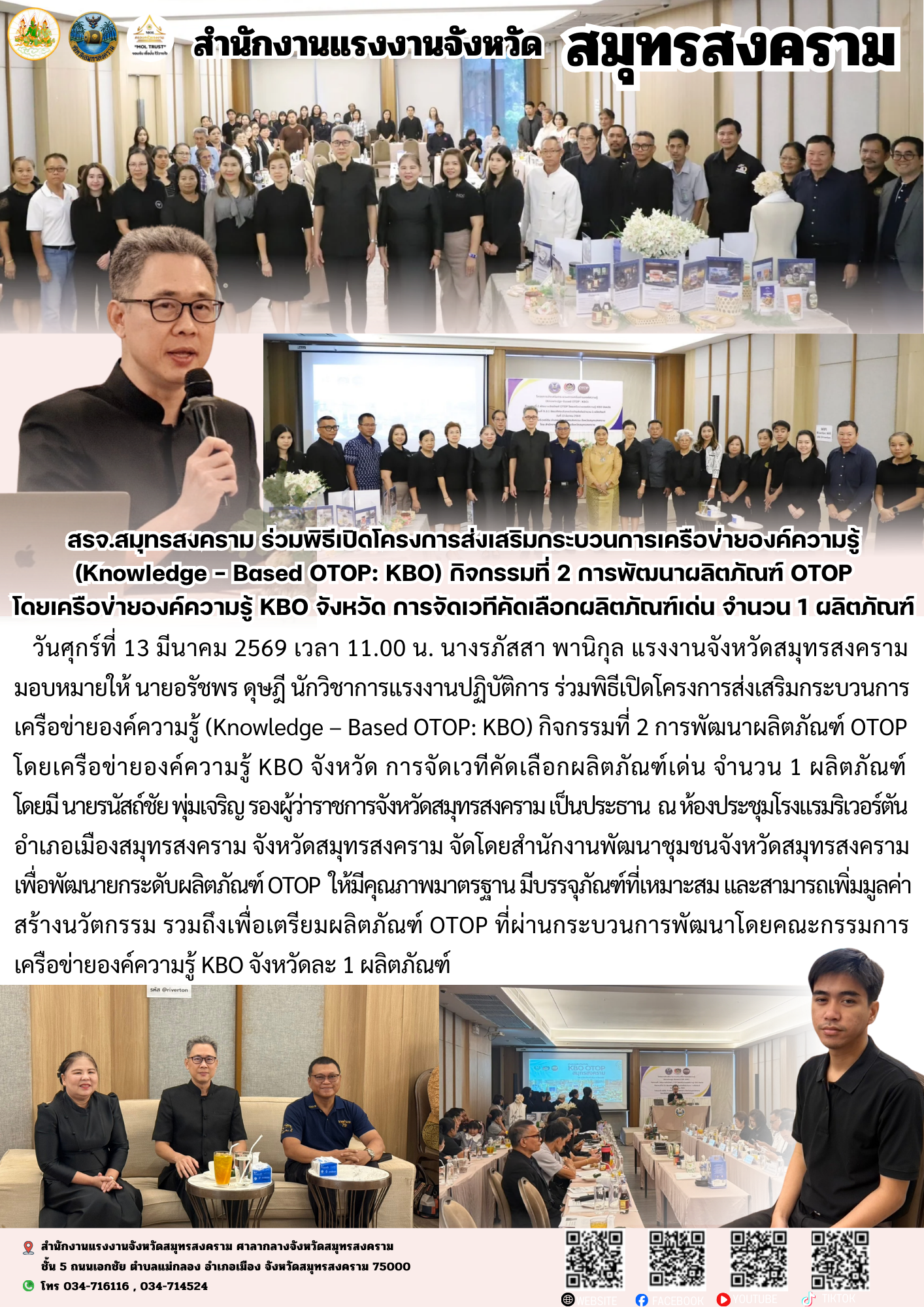 วันศุกร์ที่ 13 มีนาคม 2569 เวลา 11.00 น. นางรภัสสา พานิกุล แรงงานจังหวัดสมุทรสงคราม มอบหมายให้ นายอรัชพร ดุษฎี นักวิชาการแรงงานปฏิบัติการ ร่วมพิธีเปิดโครงการส่งเสริมกระบวนการเครือข่ายองค์ความรู้ (Knowledge – Based OTOP: KBO) กิจกรรมที่ 2 การพัฒนาผลิตภัณฑ์ OTOP โดยเครือข่ายองค์ความรู้ KBO จังหวัด การจัดเวทีคัดเลือกผลิตภัณฑ์เด่น จำนวน 1 ผลิตภัณฑ์ โดยมี นายรนัสถ์ชัย พุ่มเจริญ รองผู้ว่าราชการจังหวัดสมุทรสงคราม เป็นประธาน ณ ห้องประชุมโรงแรมริเวอร์ตัน อำเภอเมืองสมุทรสงคราม จังหวัดสมุทรสงคราม จัดโดยสำนักงานพัฒนาชุมชนจังหวัดสมุทรสงคราม เพื่อพัฒนายกระดับผลิตภัณฑ์ OTOP ให้มีคุณภาพมาตรฐาน มีบรรจุภัณฑ์ที่เหมาะสม และสามารถเพิ่มมูลค่าสร้างนวัตกรรม รวมถึงเพื่อเตรียมผลิตภัณฑ์ OTOP ที่ผ่านกระบวนการพัฒนาโดยคณะกรรมการเครือข่ายองค์ความรู้ KBO จังหวัดละ 1 ผลิตภัณฑ์