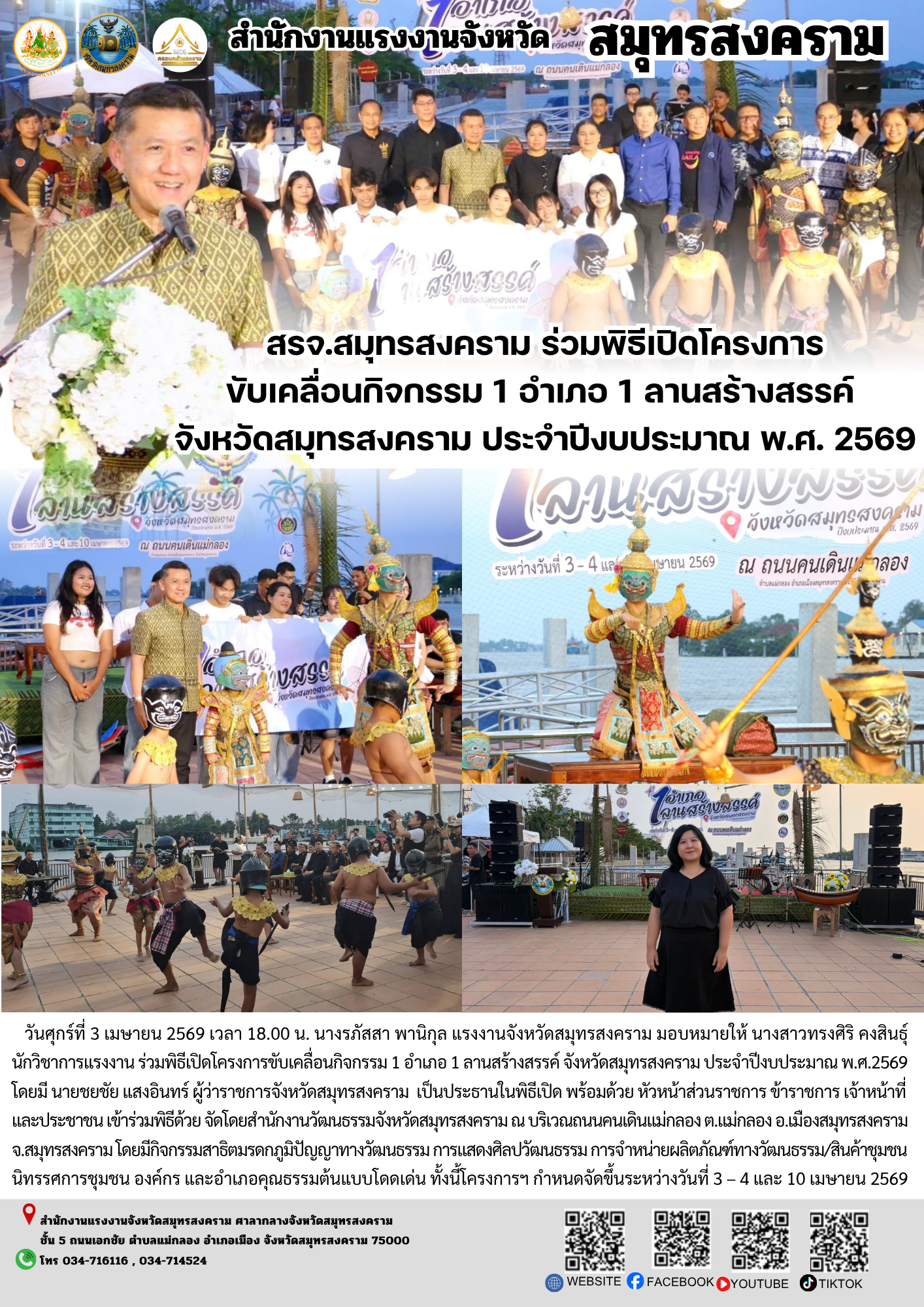 วันศุกร์ที่ 3 เมษายน 2569 เวลา 18.00 น. นางรภัสสา พานิกุล แรงงานจังหวัดสมุทรสงคราม มอบหมายให้ นางสาวทรงศิริ คงสินธุ์นักวิชาการแรงงาน ร่วมพิธีเปิดโครงการขับเคลื่อนกิจกรรม 1 อำเภอ 1 ลานสร้างสรรค์ จังหวัดสมุทรสงคราม ประจำปีงบประมาณ พ.ศ.2569 โดยมี นายชยชัย แสงอินทร์ ผู้ว่าราชการจังหวัดสมุทรสงคราม เป็นประธานในพิธีเปิด พร้อมด้วย หัวหน้าส่วนราชการ ข้าราชการ เจ้าหน้าที่ และประชาชน เข้าร่วมพิธีด้วย จัดโดยสำนักงานวัฒนธรรมจังหวัดสมุทรสงคราม ณ บริเวณถนนคนเดินแม่กลอง ต.แม่กลอง อ.เมืองสมุทรสงคราม จ.สมุทรสงคราม โดยมีกิจกรรมสาธิตมรดกภูมิปัญญาทางวัฒนธรรม การแสดงศิลปวัฒนธรรม การจำหน่ายผลิตภัณฑ์ทางวัฒนธรรม/สินค้าชุมชน นิทรรศการชุมชน องค์กร และอำเภอคุณธรรมต้นแบบโดดเด่น ทั้งนี้โครงการฯ กำหนดจัดขึ้นระหว่างวันที่ 3 – 4 และ 10 เมษายน 2569
