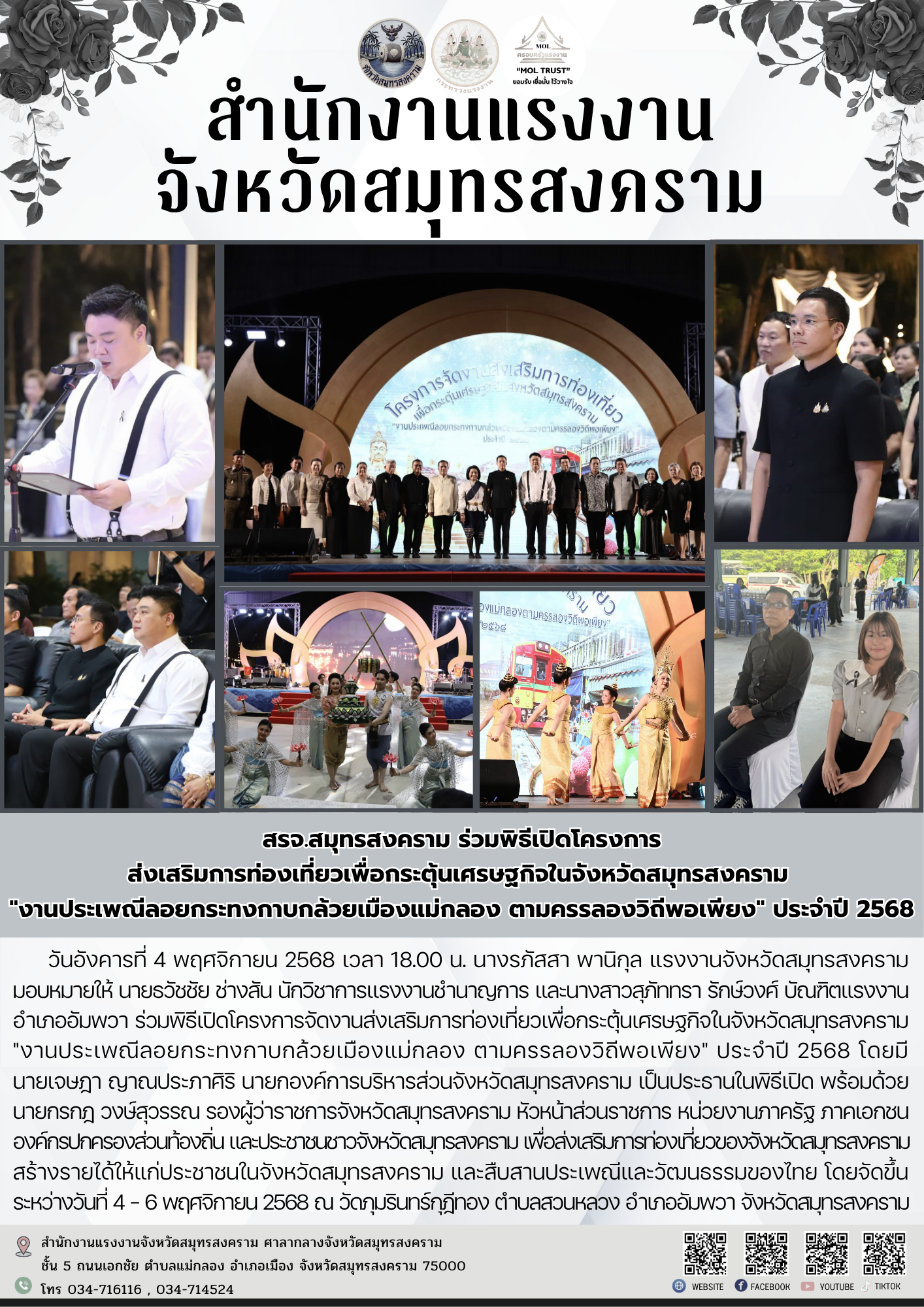 วันอังคารที่ 4 พฤศจิกายน 2568 เวลา 18.00 น. นางรภัสสา พานิกุล แรงงานจังหวัดสมุทรสงคราม มอบหมายให้ นายธวัชชัย ช่างสัน นักวิชาการแรงงานชำนาญการ และนางสาวสุภัททรา รักษ์วงศ์ บัณฑิตแรงงานอำเภออัมพวา ร่วมพิธีเปิดโครงการจัดงานส่งเสริมการท่องเที่ยวเพื่อกระตุ้นเศรษฐกิจในจังหวัดสมุทรสงคราม “งานประเพณีลอยกระทงกาบกล้วยเมืองแม่กลอง ตามครรลองวิถีพอเพียง” ประจำปี 2568 โดยมี นายเจษฎา ญาณประภาศิริ นายกองค์การบริหารส่วนจังหวัดสมุทรสงคราม เป็นประธานในพิธีเปิด พร้อมด้วย นายกรกฎ วงษ์สุวรรณ รองผู้ว่าราชการจังหวัดสมุทรสงคราม หัวหน้าส่วนราชการ หน่วยงานภาครัฐ ภาคเอกชนองค์กรปกครองส่วนท้องถิ่น และประชาชนชาวจังหวัดสมุทรสงคราม เพื่อส่งเสริมการท่องเที่ยวของจังหวัดสมุทรสงครามสร้างรายได้ให้แก่ประชาชนในจังหวัดสมุทรสงคราม และสืบสานประเพณีและวัฒนธรรมของไทย โดยจัดขึ้น ระหว่างวันที่ 4 – 6 พฤศจิกายน 2568 ณ วัดภุมรินทร์กุฎีทอง ตำบลสวนหลวง อำเภออัมพวา จังหวัดสมุทรสงคราม