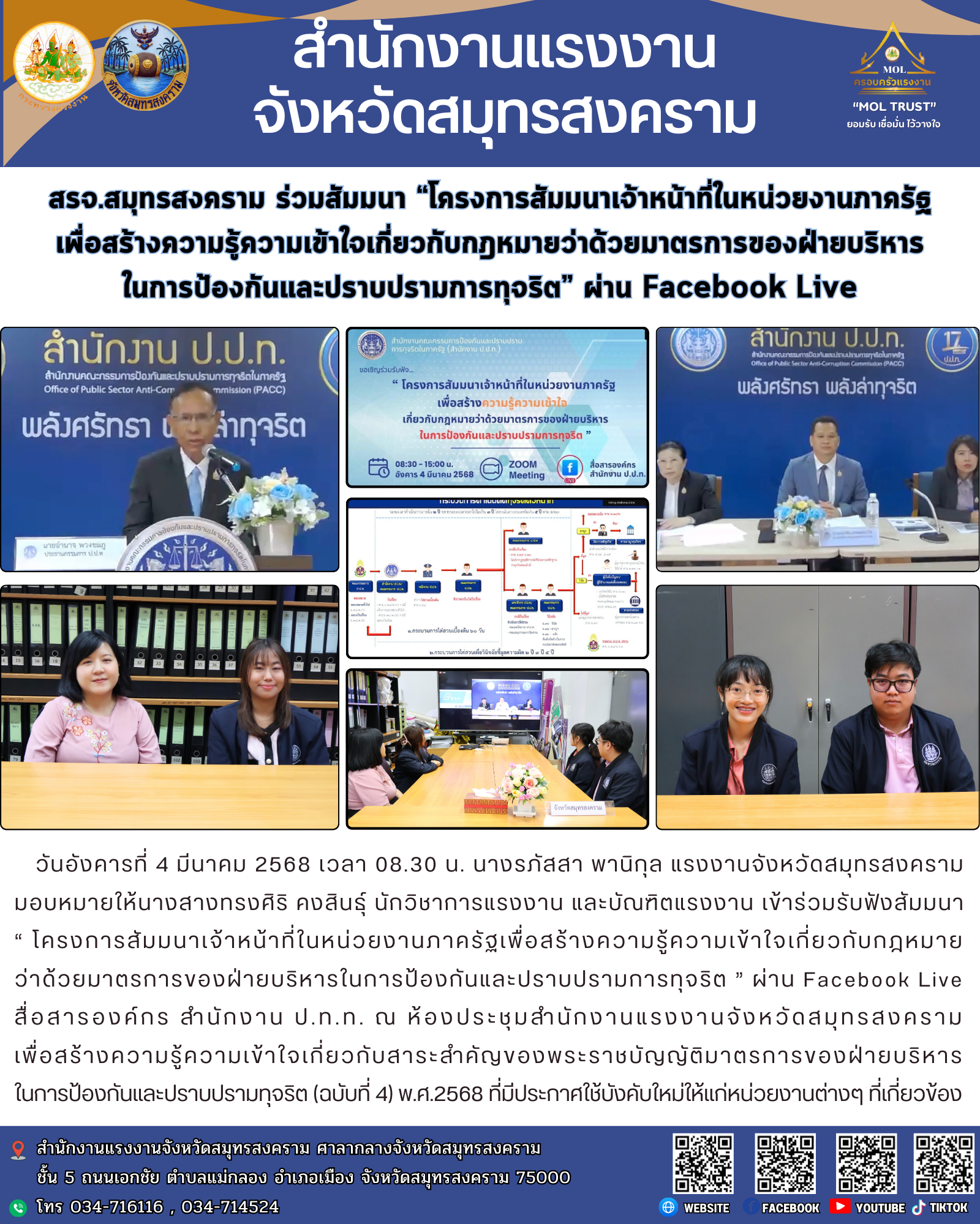 วันอังคารที่ 4 มีนาคม 2568 เวลา 08.30 น. นางรภัสสา พานิกุล แรงงานจังหวัดสมุทรสงคราม มอบหมายให้นางสางทรงศิริ คงสินธุ์ นักวิชาการแรงงาน และบัณฑิตแรงงาน เข้าร่วมรับฟังสัมมนา “ โครงการสัมมนาเจ้าหน้าที่ในหน่วยงานภาครัฐเพื่อสร้างความรู้ความเข้าใจเกี่ยวกับกฎหมาย ว่าด้วยมาตรการของฝ่ายบริหารในการป้องกันและปราบปรามการทุจริต ” ผ่าน Facebook Live สื่อสารองค์กร สำนักงาน ป.ท.ท. ณ ห้องประชุมสำนักงานแรงงานจังหวัดสมุทรสงคราม เพื่อสร้างความรู้ความเข้าใจเกี่ยวกับสาระสำคัญของพระราชบัญญัติมาตรการของฝ่ายบริหาร ในการป้องกันและปราบปรามทุจริต (ฉบับที่ 4) พ.ศ.2568 ที่มีประกาศใช้บังคับใหม่ให้แก่หน่วยงานต่างๆ ที่เกี่ยวข้อง