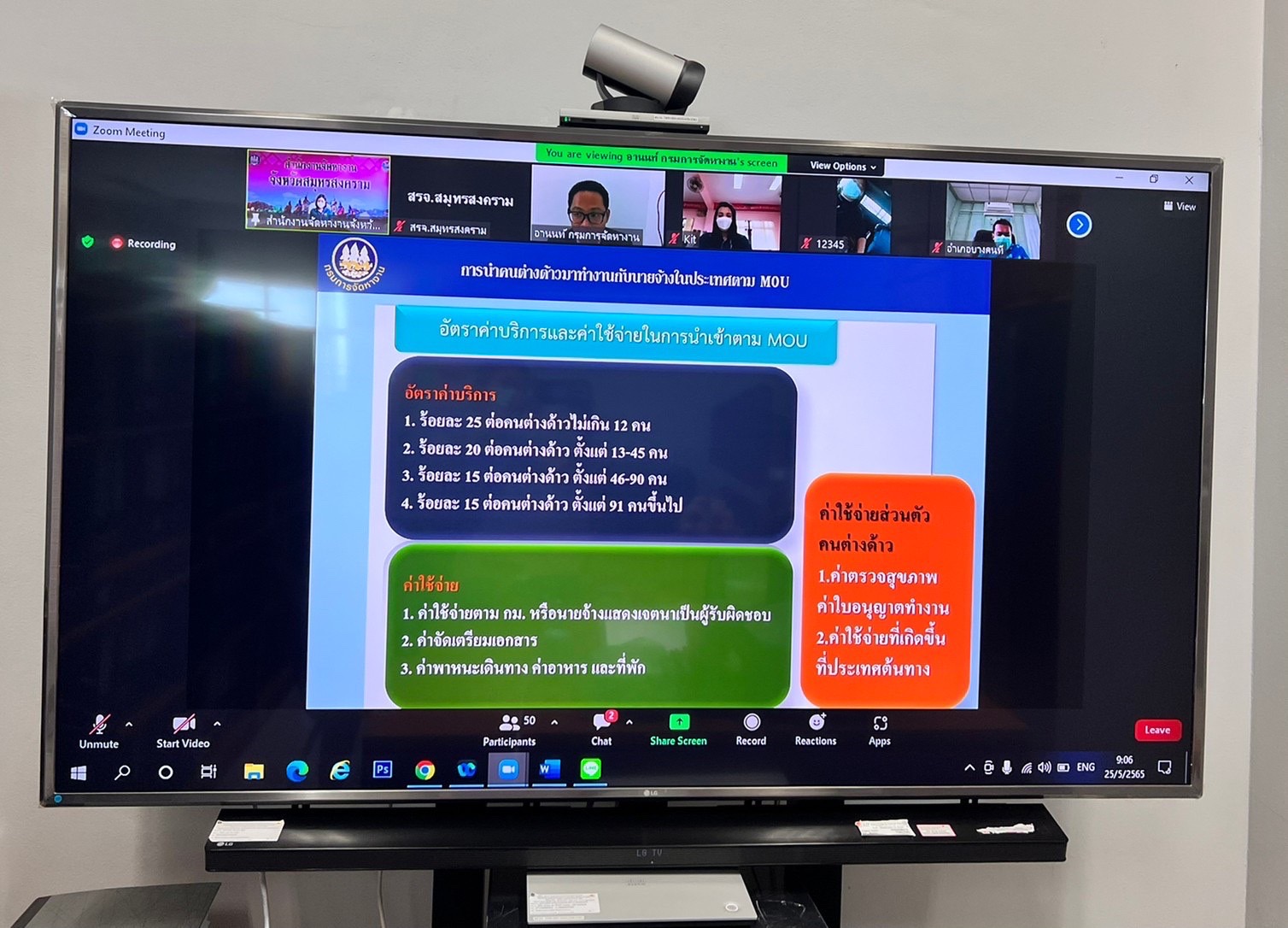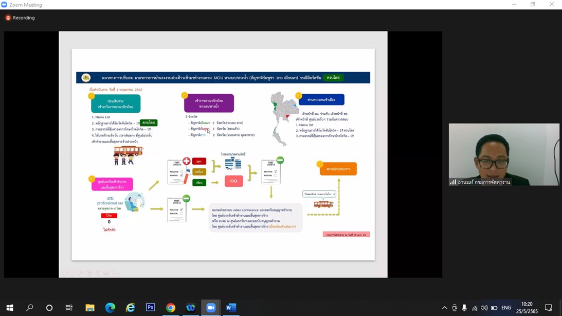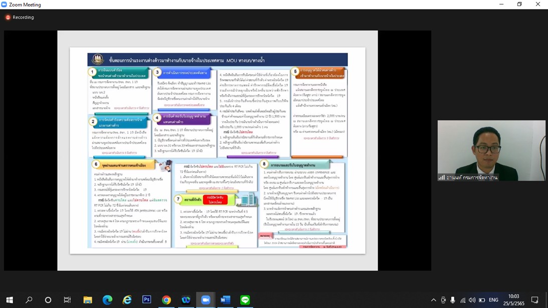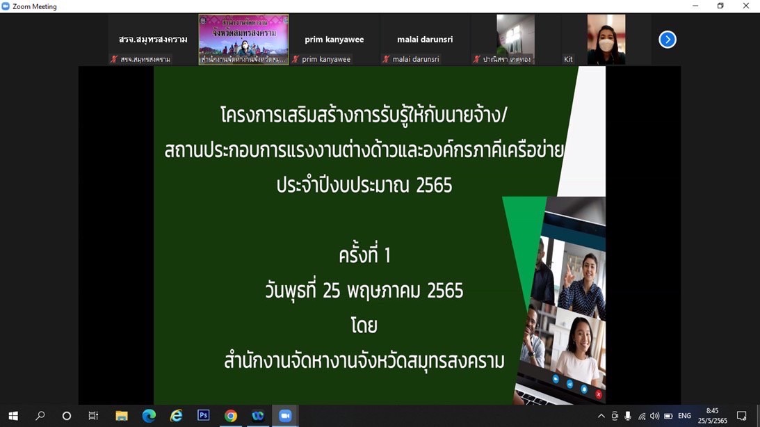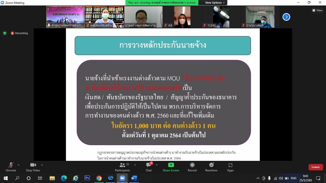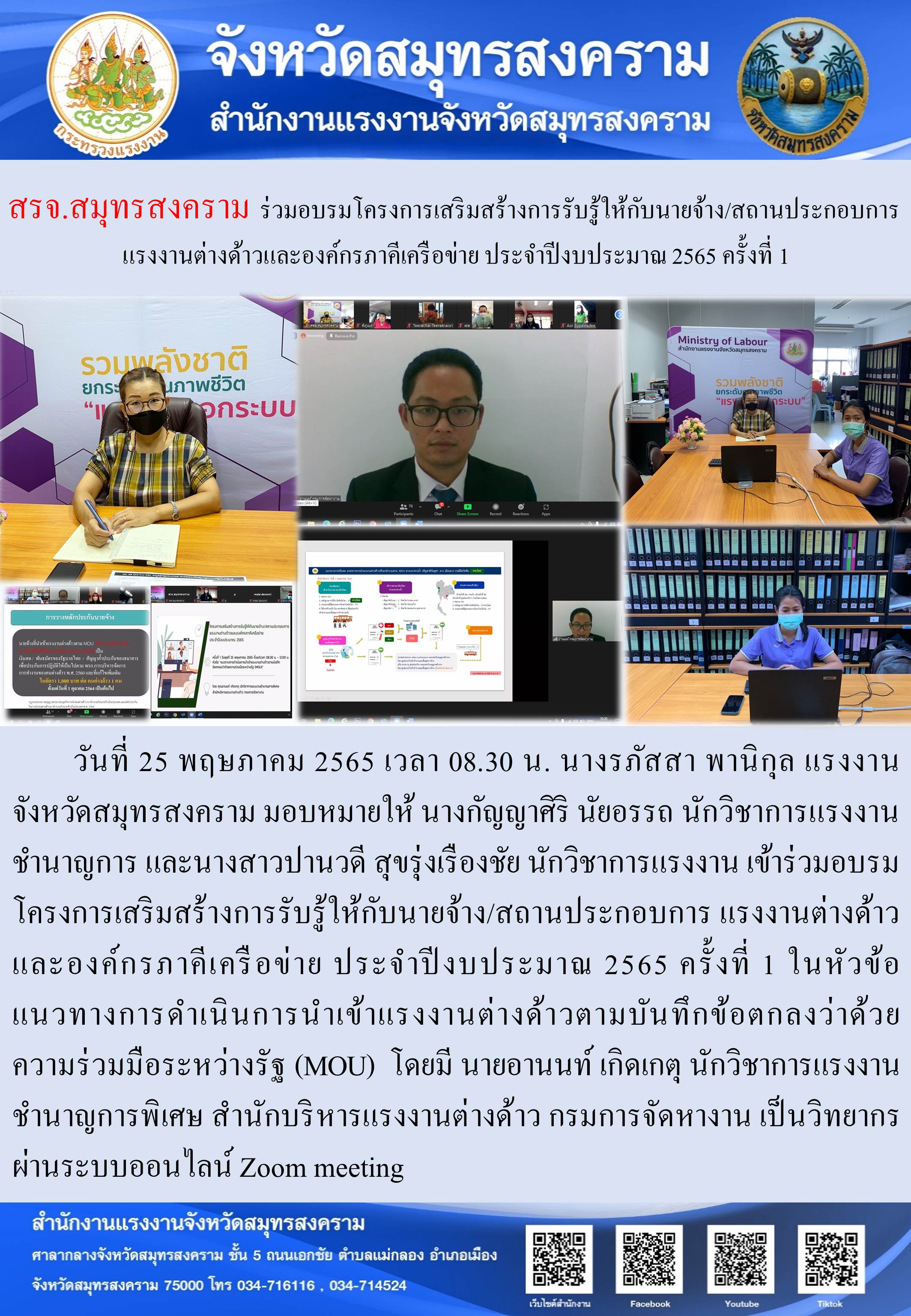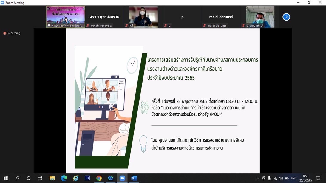 วันที่ 25 พฤษภาคม 2565 เวลา 08.30 น. นางรภัสสา พานิกุล แรงงานจังหวัดสมุทรสงคราม มอบหมายให้ นางกัญญาศิริ นัยอรรถ นักวิชาการแรงงานชำนาญการ และนางสาวปานวดี สุขรุ่งเรืองชัย นักวิชาการแรงงาน เข้าร่วมอบรมโครงการเสริมสร้างการรับรู้ให้กับนายจ้าง/สถานประกอบการ แรงงานต่างด้าวและองค์กรภาคีเครือข่าย ประจำปีงบประมาณ 2565 ครั้งที่ 1 ในหัวข้อ แนวทางการดำเนินการนำเข้าแรงงานต่างด้าวตามบันทึกข้อตกลงว่าด้วยความร่วมมือระหว่างรัฐ (MOU) โดยมี นายอานนท์ เกิดเกตุ นักวิชาการแรงงานชำนาญการพิเศษ สำนักบริหารแรงงานต่างด้าว กรมการจัดหางาน เป็นวิทยากร ผ่านระบบออนไลน์ Zoom meeting