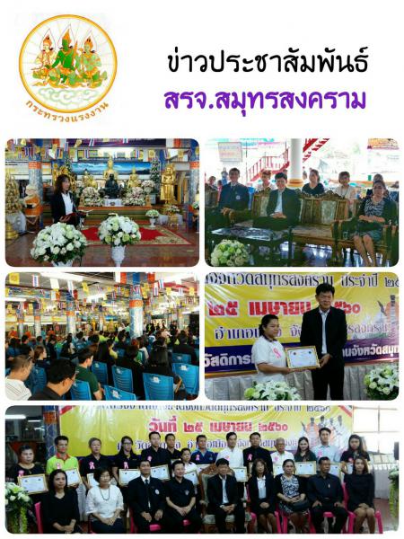 วันนี้ (25 เมษายน 2560) เวลา 09.30 น. สำนักงานแรงงานจังหวัดสมุทรสงคราม ร่วมเป็นเกียรติในพิธีเปิดงานวันแรงงานแห่งชาติจังหวัดสมุทรสงคราม ประจำปี 2560 ณ วัดลาดเป้ง ต.นางตะเคียน อ.เมือง จ.สมุทรสงคราม จัดโดยสำนักงานสวัสดิการและคุ้มครองแรงงานจังหวัดสมุทรสงคราม กิจกรรมประกอบด้วย พิธีมอบเกียรติบัตรผู้บริหารและพนักงานดีเด่น มอบเกียรติบัตรโรงงานสีขาว และพิธีทอดผ้าป่าถวายเป็นพระราชกุศลแด่พระบาทสมเด็จพระปรมินทรมหาภูมิพลอดุลยเดช