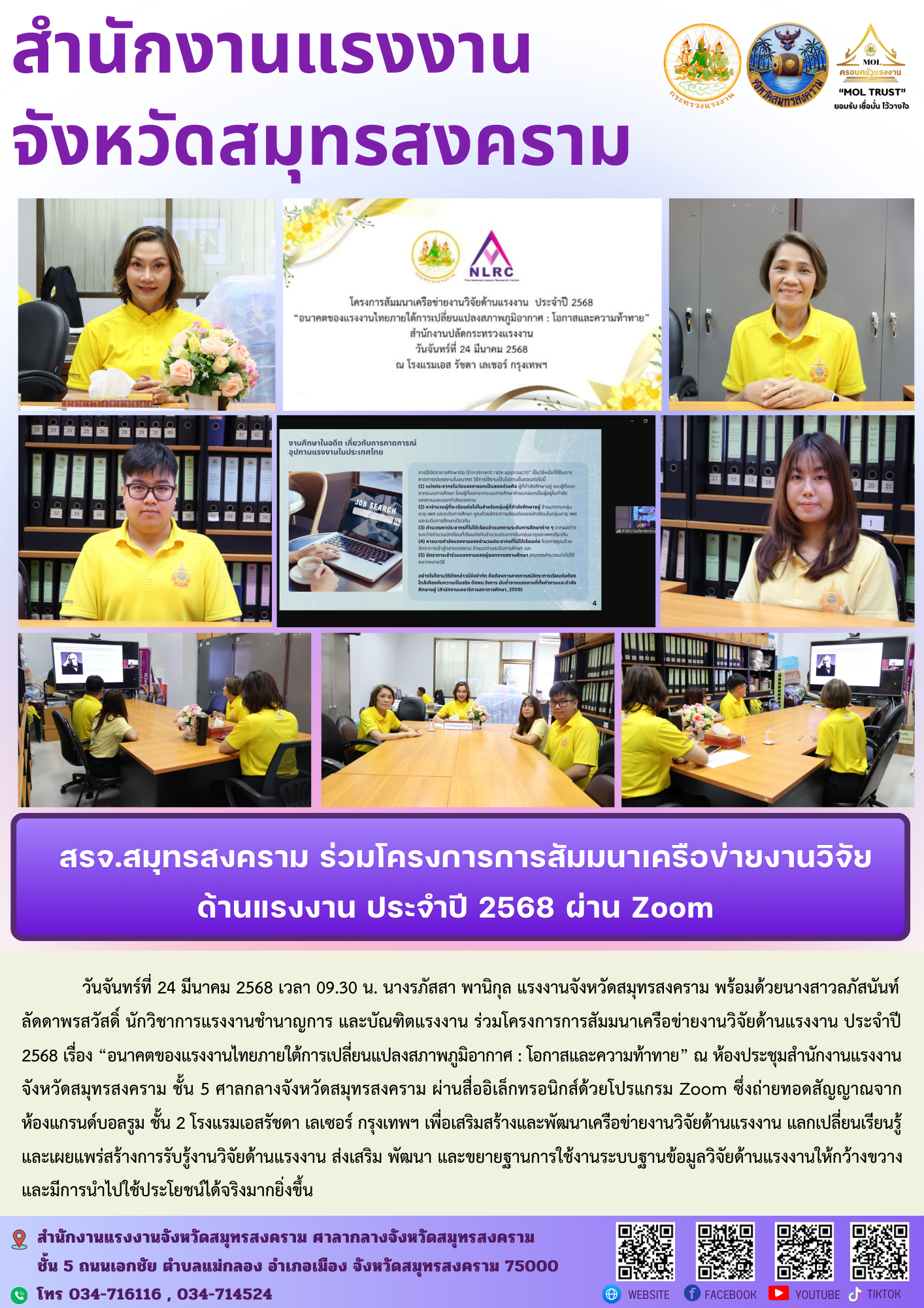 วันจันทร์ที่ 24 มีนาคม 2568 เวลา 09.30 น. นางรภัสสา พานิกุล แรงงานจังหวัดสมุทรสงคราม พร้อมด้วยนางสาวลภัสนันท์ ลัดดาพรสวัสดิ์ นักวิชาการแรงงานชำนาญการ และบัณฑิตแรงงาน ร่วมโครงการการสัมมนาเครือข่ายงานวิจัยด้านแรงงาน ประจำปี 2568 เรื่อง “อนาคตของแรงงานไทยภายใต้การเปลี่ยนแปลงสภาพภูมิอากาศ : โอกาสและความท้าทาย” ณ ห้องประชุมสำนักงานแรงงานจังหวัดสมุทรสงคราม ชั้น 5 ศาลกลางจังหวัดสมุทรสงคราม ผ่านสื่ออิเล็กทรอนิกส์ด้วยโปรแกรม Zoom ซึ่งถ่ายทอดสัญญาณจาก ห้องแกรนด์บอลรูม ชั้น 2 โรงแรมเอสรัชดา เลเซอร์ กรุงเทพฯ เพื่อเสริมสร้างและพัฒนาเครือข่ายงานวิจัยด้านแรงงาน แลกเปลี่ยนเรียนรู้ และเผยแพร่สร้างการรับรู้งานวิจัยด้านแรงงาน ส่งเสริม พัฒนา และขยายฐานการใช้งานระบบฐานข้อมูลวิจัยด้านแรงงานให้กว้างขวาง และมีการนำไปใช้ประโยชน์ได้จริงมากยิ่งขึ้น