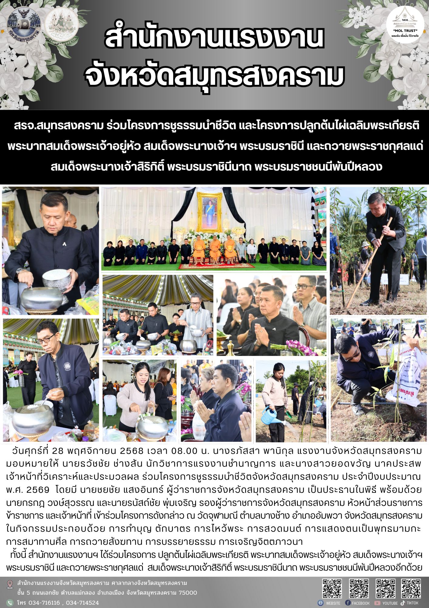 วันศุกร์ที่ 28 พฤศจิกายน 2568 เวลา 08.00 น. นางรภัสสา พานิกุล แรงงานจังหวัดสมุทรสงคราม มอบหมายให้ นายธวัชชัย ช่างสัน นักวิชาการแรงงานชำนาญการ และนางสาวยอดขวัญ นาคประสพ เจ้าหน้าที่วิเคราะห์และประมวลผล ร่วมโครงการชูธรรมนำชีวิตจังหวัดสมุทรสงคราม ประจำปีงบประมาณ พ.ศ. 2569 โดยมี นายชยชัย แสงอินทร์ ผู้ว่าราชการจังหวัดสมุทรสงคราม เป็นประธานในพิธี พร้อมด้วยนายกรกฎ วงษ์สุวรรณ และนายรนัสถ์ชัย พุ่มเจริญ รองผู้ว่าราชการจังหวัดสมุทรสงคราม หัวหน้าส่วนราชการ ข้าราชการ และเจ้าหน้าที่ เข้าร่วมโครงการดังกล่าว ณ วัดจุฬามณี ตำบลบางช้าง อำเภออัมพวา จังหวัดสมุทรสงครามในกิจกรรมประกอบด้วย การทำบุญ ตักบาตร การไหว้พระ การสวดมนต์ การแสดงตนเป็นพุทธมามกะ การสมาทานศีล การถวายสังฆทาน การบรรยายธรรม การเจริญจิตตภาวนา