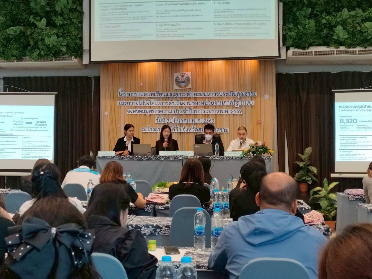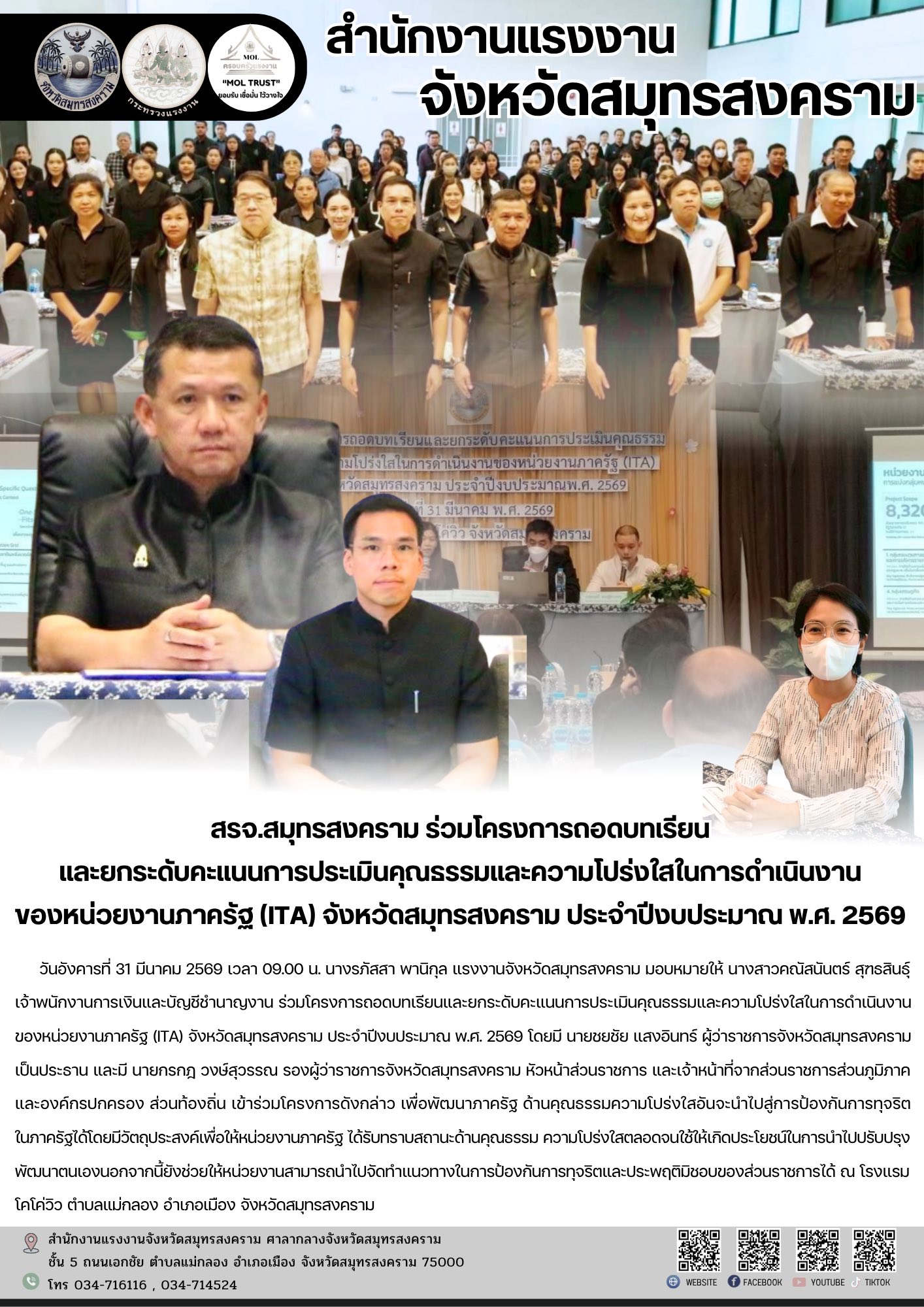 วันอังคารที่ 31 มีนาคม 2569 เวลา 09.00 น. นางรภัสสา พานิกุล แรงงานจังหวัดสมุทรสงคราม มอบหมายให้ นางสาวคณัสนันตร์ สุฑธสินธุ์ เจ้าพนักงานการเงินและบัญชีชำนาญงาน ร่วมโครงการถอดบทเรียนและยกระดับคะแนนการประเมินคุณธรรมและความโปร่งใสในการดำเนินงานของหน่วยงานภาครัฐ (ITA) จังหวัดสมุทรสงคราม ประจำปีงบประมาณ พ.ศ. 2569 โดยมี นายชยชัย แสงอินทร์ ผู้ว่าราชการจังหวัดสมุทรสงคราม เป็นประธาน และมี นายกรกฎ วงษ์สุวรรณ รองผู้ว่าราชการจังหวัดสมุทรสงคราม หัวหน้าส่วนราชการ และเจ้าหน้าที่จากส่วนราชการส่วนภูมิภาคและองค์กรปกครอง ส่วนท้องถิ่น เข้าร่วมโครงการดังกล่าว เพื่อพัฒนาภาครัฐ ด้านคุณธรรมความโปร่งใสอันจะนำไปสู่การป้องกันการทุจริตในภาครัฐได้โดยมีวัตถุประสงค์เพื่อให้หน่วยงานภาครัฐ ได้รับทราบสถานะด้านคุณธรรม ความโปร่งใสตลอดจนใช้ให้เกิดประโยชน์ในการนำไปปรับปรุง พัฒนาตนเองนอกจากนี้ยังช่วยให้หน่วยงานสามารถนำไปจัดทำแนวทางในการป้องกันการทุจริตและประพฤติมิชอบของส่วนราชการได้ ณ โรงแรม โคโค่วิว ตำบลแม่กลอง อำเภอเมือง จังหวัดสมุทรสงคราม