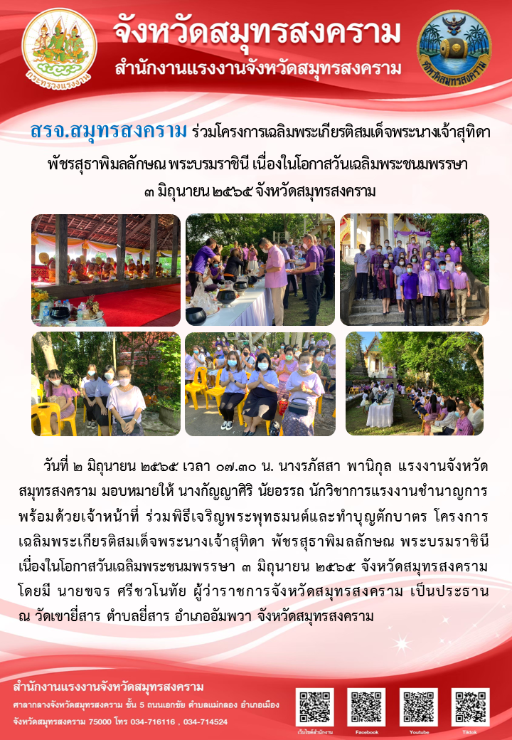 วันที่ 2 มิถุนายน 2565 เวลา 07.30 น. นางรภัสสา พานิกุล แรงงานจังหวัดสมุทรสงคราม มอบหมายให้ นางกัญญาศิริ นัยอรรถ นักวิชาการแรงงานชำนาญการ พร้อมด้วยเจ้าหน้าที่ ร่วมพิธีเจริญพระพุทธมนต์และทำบุญตักบาตร โครงการเฉลิมพระเกียรติสมเด็จพระนางเจ้าสุทิดา พัชรสุธาพิมลลักษณ พระบรมราชินี เนื่องในโอกาสวันเฉลิมพระชนมพรรษา 3 มิถุนายน 2565 จังหวัดสมุทรสงคราม โดยมี นายขจร ศรีชวโนทัย ผู้ว่าราชการจังหวัดสมุทรสงคราม เป็นประธาน ณ วัดเขายี่สาร ตำบลยี่สาร อำเภออัมพวา จังหวัดสมุทรสงคราม