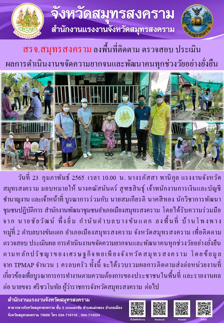 วันที่ 23 กุมภาพันธ์ 2565 เวลา 10.00 น. นางรภัสสา พานิกุล แรงงานจังหวัดสมุทรสงคราม มอบหมายให้ นางคณัสนันตร์ สุฑธสินธุ์ เจ้าพนักงานการเงินและบัญชีชำนาญงาน และเจ้าหน้าที่ บูรณาการร่วมกับ นายสมเกียรติ นาคสีทอง นักวิชาการพัฒนาชุมชนปฏิบัติการ สำนักงานพัฒนาชุมชนอำเภอเมืองสมุทรสงคราม โดยได้รับความร่วมมือจาก นายชัยวัฒน์ พึ่งอิ่ม กำนันตำบลบางขันแตก ลงพื้นที่ บ้านโพงพาง หมู่ที่ 2 ตำบลบางขันแตก อำเภอเมืองสมุทรสงคราม จังหวัดสมุทรสงคราม เพื่อติดตาม ตรวจสอบ ประเมินผล การดำเนินงานขจัดความยากจนและพัฒนาคนทุกช่วงวัยอย่างยั่งยืน ตามหลักปรัชญาของเศรษฐกิจพอเพียงจังหวัดสมุทรสงคราม โดยข้อมูลจาก TPMAP จำนวน 1 ครอบครัว ทั้งนี้ จะได้รวบรวมผลการติดตามส่งต่อหน่วยงานที่เกี่ยวข้องเพื่อบูรณาการการทำงานตามความต้องการของประชาชนในพื้นที่ และรายงานผลต่อ นายขจร ศรีชวโนทัย ผู้ว่าราชการจังหวัดสมุทรสงคราม ต่อไป