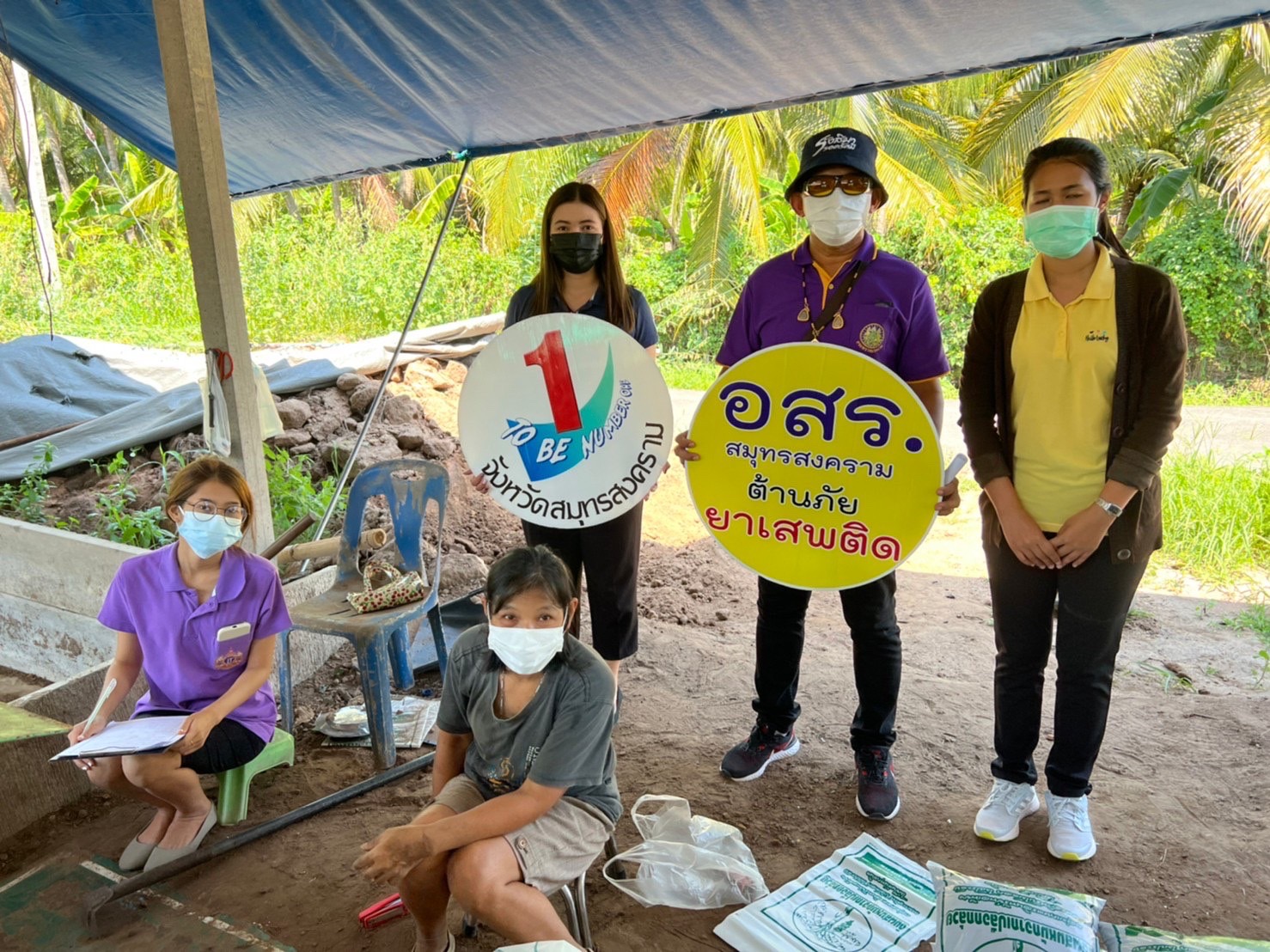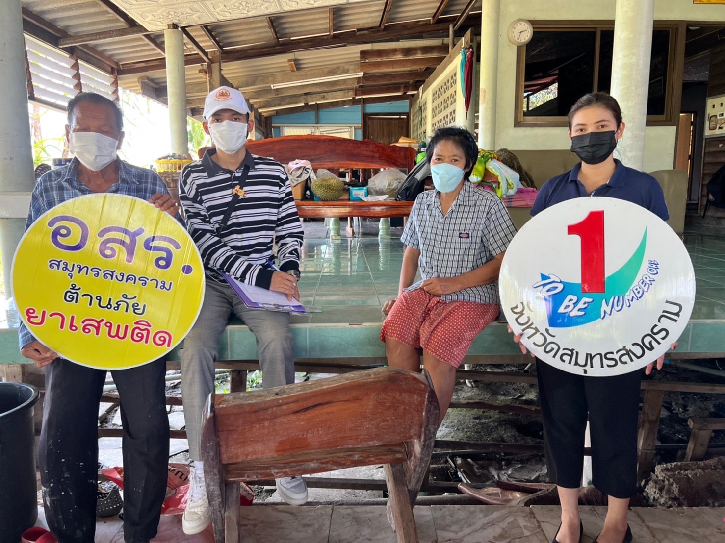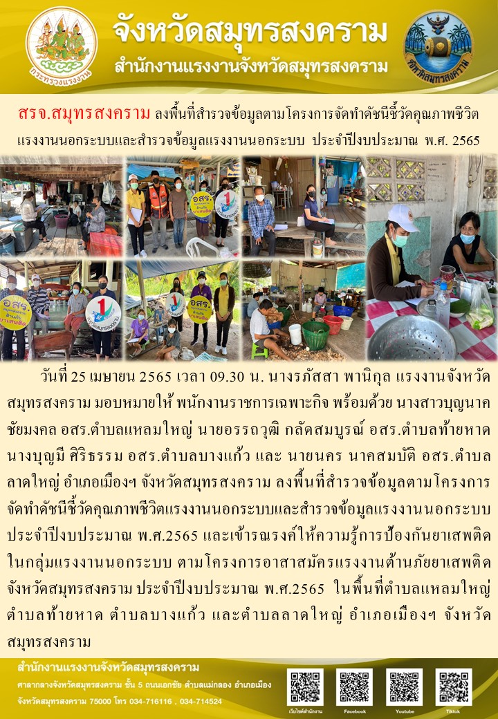 วันที่ 25 เมษายน 2565 เวลา 09.30 น. นางรภัสสา พานิกุล แรงงานจังหวัดสมุทรสงคราม มอบหมายให้ พนักงานราชการเฉพาะกิจ พร้อมด้วย นางสาวบุญนาค ชัยมงคล อสร.ตำบลแหลมใหญ่ นายอรรถวุฒิ กลัดสมบูรณ์ อสร.ตำบลท้ายหาด นางบุญมี ศิริธรรม อสร.ตำบลบางแก้ว และ นายนคร นาคสมบัติ อสร.ตำบลลาดใหญ่ อำเภอเมืองฯ จังหวัดสมุทรสงคราม ลงพื้นที่สำรวจข้อมูลตามโครงการจัดทำดัชนีชี้วัดคุณภาพชีวิตแรงงานนอกระบบและสำรวจข้อมูลแรงงานนอกระบบ ประจำปีงบประมาณ พ.ศ.2565 และเข้ารณรงค์ให้ความรู้การป้องกันยาเสพติดในกลุ่มแรงงานนอกระบบ ตามโครงการอาสาสมัครแรงงานต้านภัยยาเสพติดจังหวัดสมุทรสงคราม ประจำปีงบประมาณ พ.ศ.2565 ในพื้นที่ตำบลแหลมใหญ่ ตำบลท้ายหาด ตำบลบางแก้ว และตำบลลาดใหญ่ อำเภอเมืองฯ จังหวัดสมุทรสงคราม