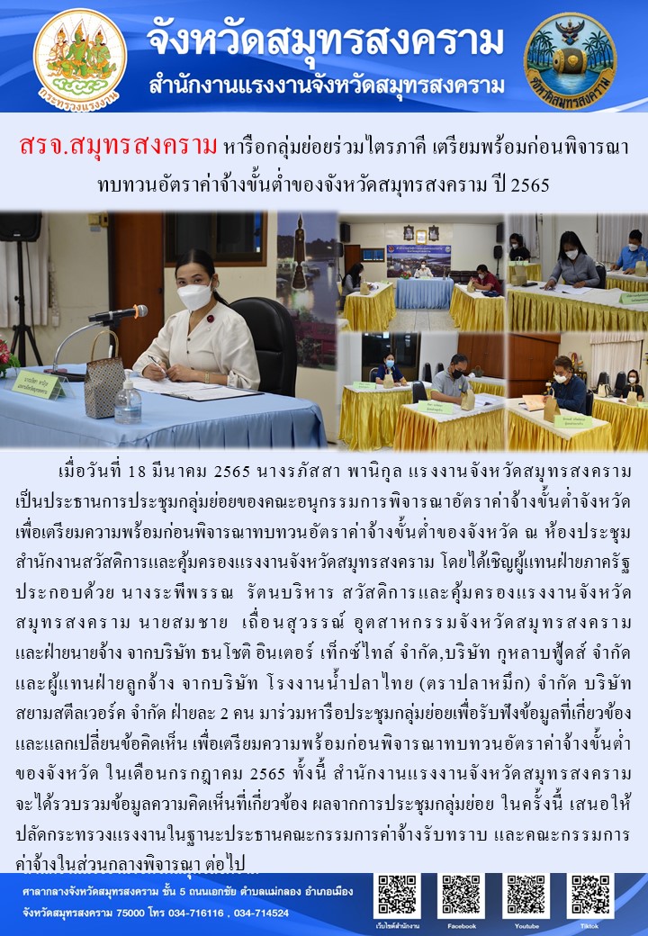เมื่อวันที่ 18 มีนาคม 2565 นางรภัสสา พานิกุล แรงงานจังหวัดสมุทรสงคราม เป็นประธานการประชุมกลุ่มย่อยของคณะอนุกรรมการพิจารณาอัตราค่าจ้างขั้นต่ำจังหวัด เพื่อเตรียมความพร้อมก่อนพิจารณาทบทวนอัตราค่าจ้างขั้นต่ำของจังหวัด ณ ห้องประชุมสำนักงานสวัสดิการและคุ้มครองแรงงานจังหวัดสมุทรสงคราม โดยได้เชิญผู้แทนฝ่ายภาครัฐ ประกอบด้วย นางระพีพรรณ รัตนบริหาร สวัสดิการและคุ้มครองแรงงานจังหวัดสมุทรสงคราม นายสมชาย เถื่อนสุวรรณ์ อุตสาหกรรมจังหวัดสมุทรสงคราม