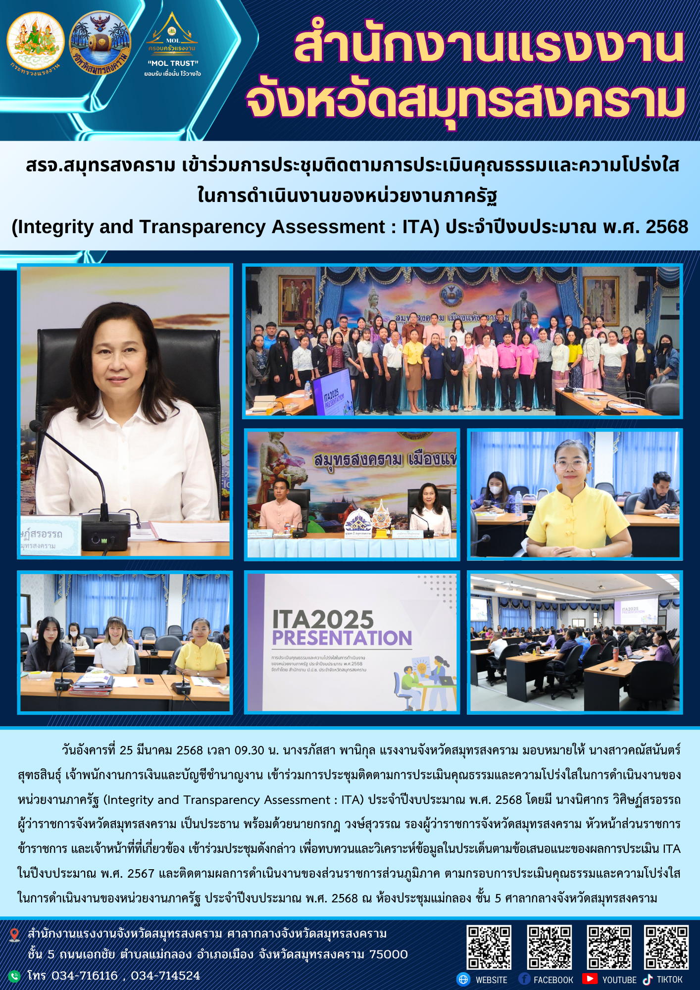 วันอังคารที่ 25 มีนาคม 2568 เวลา 09.30 น. นางรภัสสา พานิกุล แรงงานจังหวัดสมุทรสงคราม มอบหมายให้ นางสาวคณัสนันตร์ สุฑธสินธุ์ เจ้าพนักงานการเงินและบัญชีชำนาญงาน เข้าร่วมการประชุมติดตามการประเมินคุณธรรมและความโปร่งใสในการดำเนินงานของหน่วยงานภาครัฐ (Integrity and Transparency Assessment : ITA) ประจำปีงบประมาณ พ.ศ. 2568 โดยมี นางนิศากร วิศิษฏ์สรอรรถ ผู้ว่าราชการจังหวัดสมุทรสงคราม เป็นประธาน พร้อมด้วยนายกรกฎ วงษ์สุวรรณ รองผู้ว่าราชการจังหวัดสมุทรสงคราม หัวหน้าส่วนราชการ ข้าราชการ และเจ้าหน้าที่ที่เกี่ยวข้อง เข้าร่วมประชุมดังกล่าว เพื่อทบทวนและวิเคราะห์ข้อมูลในประเด็นตามข้อเสนอแนะของผลการประเมิน ITA ในปีงบประมาณ พ.ศ. 2567 และติดตามผลการดำเนินงานของส่วนราชการส่วนภูมิภาค ตามกรอบการประเมินคุณธรรมและความโปร่งใสในการดำเนินงานของหน่วยงานภาครัฐ ประจำปีงบประมาณ พ.ศ. 2568 ณ ห้องประชุมแม่กลอง ชั้น 5 ศาลากลางจังหวัดสมุทรสงคราม