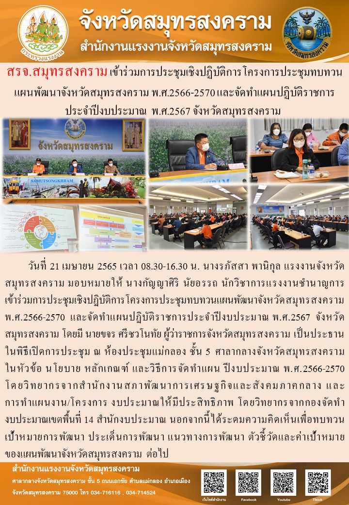 วันที่ 21 เมษายน 2565 เวลา 08.30-16.30 น. นางรภัสสา พานิกุล แรงงานจังหวัดสมุทรสงคราม มอบหมายให้ นางกัญญาศิริ นัยอรรถ นักวิชาการแรงงานชำนาญการ เข้าร่วมการประชุมเชิงปฏิบัติการโครงการประชุมทบทวนแผนพัฒนาจังหวัดสมุทรสงคราม พ.ศ.2566-2570 และจัดทำแผนปฏิบัติราชการประจำปีงบประมาณ พ.ศ.2567 จังหวัดสมุทรสงคราม โดยมี นายขจร ศรีชวโนทัย ผู้ว่าราชการจังหวัดสมุทรสงคราม เป็นประธานในพิธีเปิดการประชุม ณ ห้องประชุมแม่กลอง ชั้น 5 ศาลากลางจังหวัดสมุทรสงคราม ในหัวข้อ นโยบาย หลักเกณฑ์ และวิธีการจัดทำแผน ปีงบประมาณ พ.ศ.2566-2570 โดยวิทยากรจากสำนักงานสภาพัฒนาการเศรษฐกิจและสังคมภาคกลาง และ การทำแผนงาน/โครงการ งบประมาณให้มีประสิทธิภาพ โดยวิทยากรจากกองจัดทำงบประมาณเขตพื้นที่ 14 สำนักงบประมาณ นอกจากนี้ได้ระดมความคิดเห็นเพื่อทบทวนเป้าหมายการพัฒนา ประเด็นการพัฒนา แนวทางการพัฒนา ตัวชี้วัดและค่าเป้าหมายของแผนพัฒนาจังหวัดสมุทรสงคราม ต่อไป