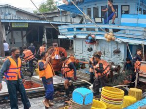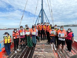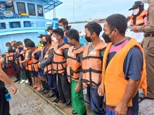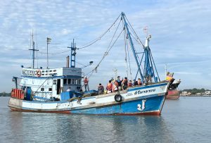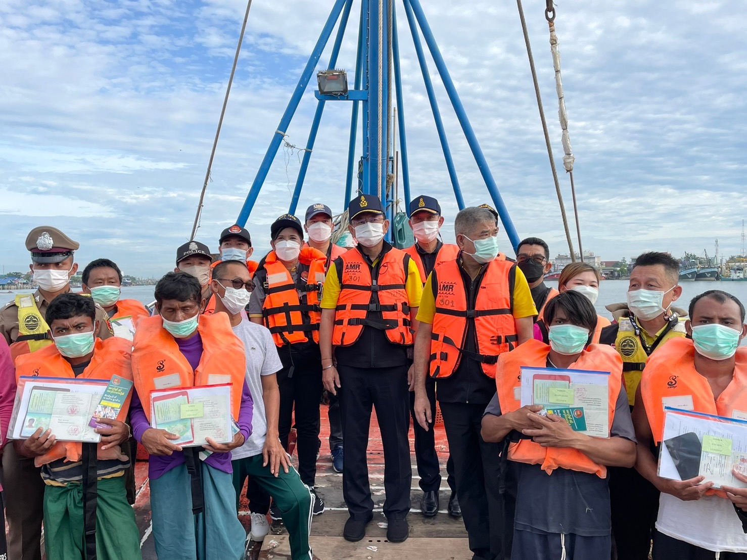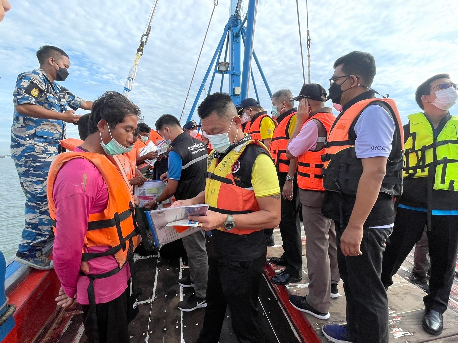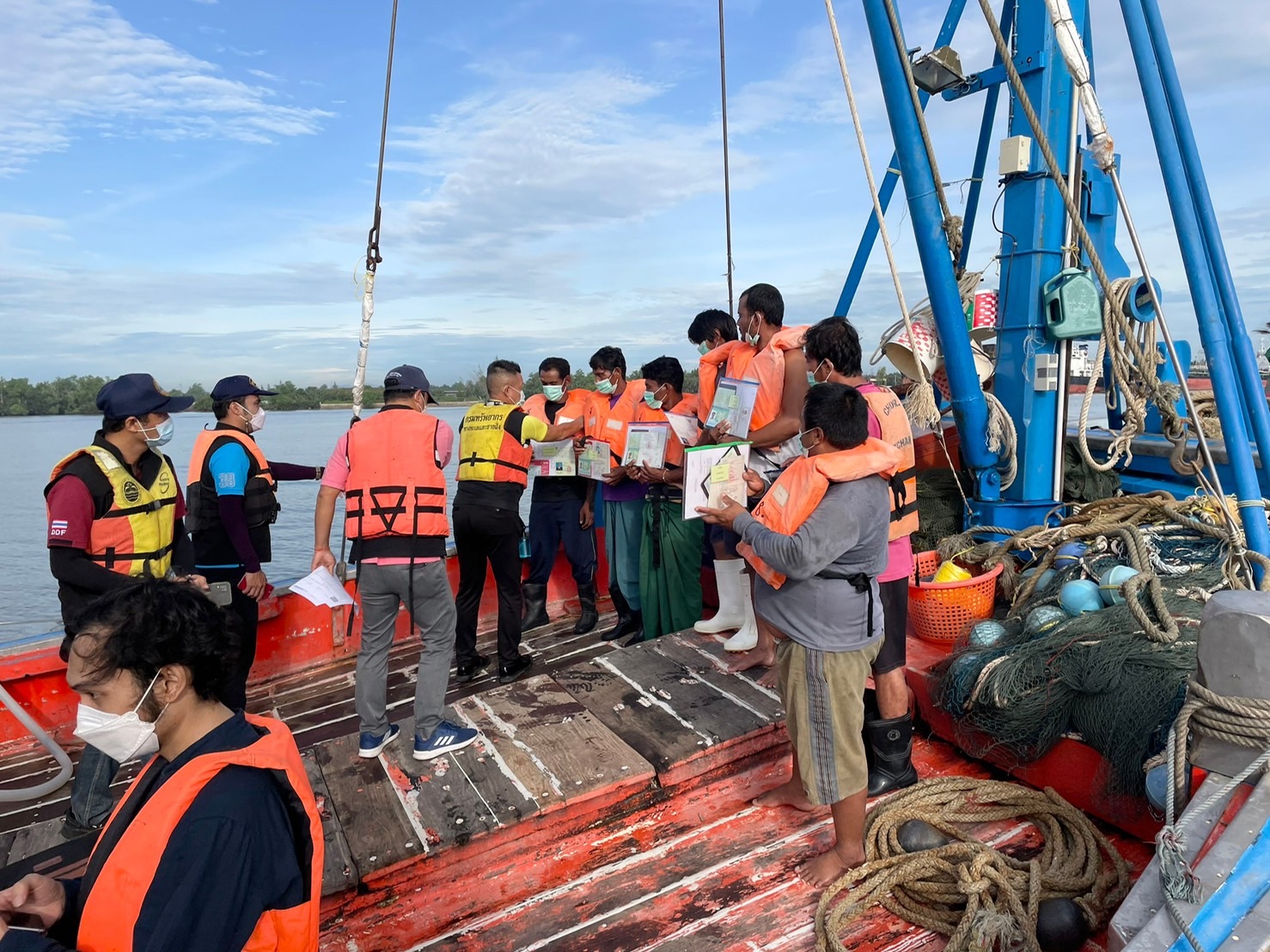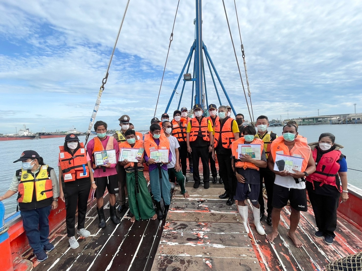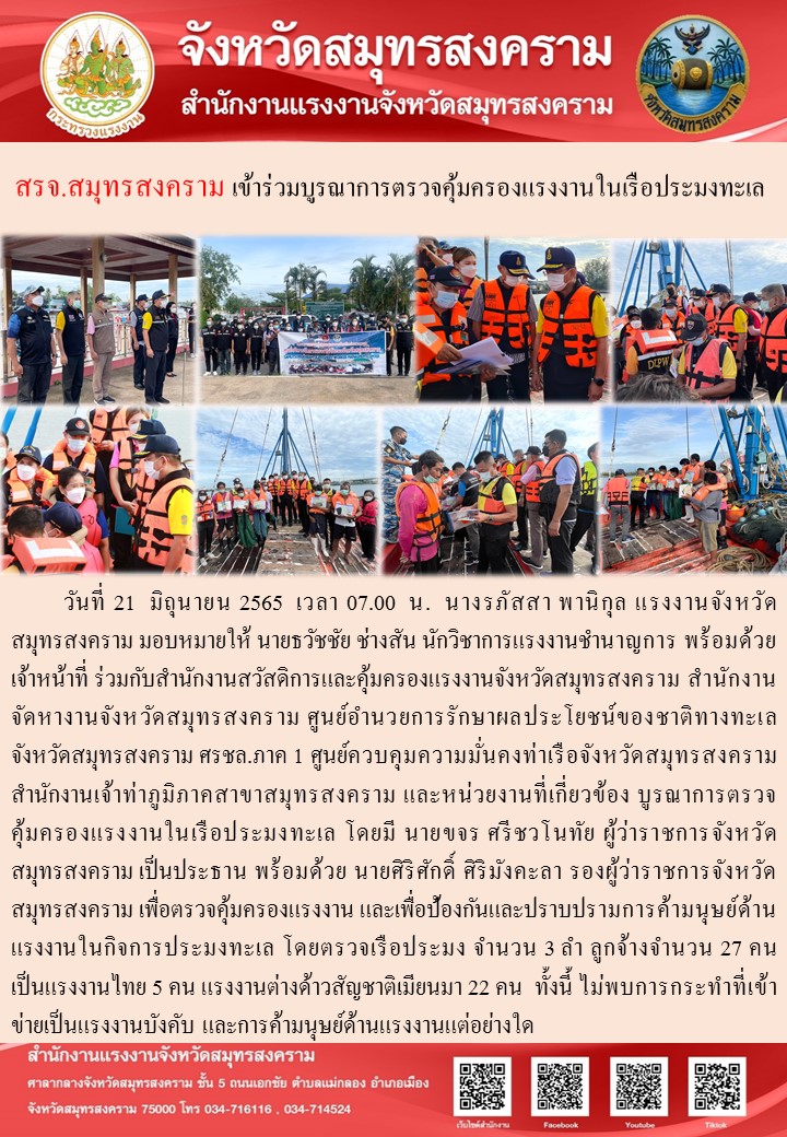 วันที่ 21 มิถุนายน 2565 เวลา 07.00 น. นางรภัสสา พานิกุล แรงงานจังหวัดสมุทรสงคราม มอบหมายให้ นายธวัชชัย ช่างสัน นักวิชาการแรงงานชำนาญการ พร้อมด้วยเจ้าหน้าที่ ร่วมกับสำนักงานสวัสดิการและคุ้มครองแรงงานจังหวัดสมุทรสงคราม สำนักงานจัดหางานจังหวัดสมุทรสงคราม ศูนย์อำนวยการรักษาผลประโยชน์ของชาติทางทะเลจังหวัดสมุทรสงคราม ศรชล.ภาค 1 ศูนย์ควบคุมความมั่นคงท่าเรือจังหวัดสมุทรสงคราม สำนักงานเจ้าท่าภูมิภาคสาขาสมุทรสงคราม และหน่วยงานที่เกี่ยวข้อง บูรณาการตรวจคุ้มครองแรงงานในเรือประมงทะเล โดยมี นายขจร ศรีชวโนทัย ผู้ว่าราชการจังหวัดสมุทรสงคราม เป็นประธาน พร้อมด้วย นายศิริศักดิ์ ศิริมังคะลา รองผู้ว่าราชการจังหวัดสมุทรสงคราม เพื่อตรวจคุ้มครองแรงงาน และเพื่อป้องกันและปราบปรามการค้ามนุษย์ด้านแรงงานในกิจการประมงทะเล โดยตรวจเรือประมง จำนวน 3 ลำ ลูกจ้างจำนวน 27 คน เป็นแรงงานไทย 5 คน แรงงานต่างด้าวสัญชาติเมียนมา 22 คน ทั้งนี้ ไม่พบการกระทำที่เข้าข่ายเป็นแรงงานบังคับ และการค้ามนุษย์ด้านแรงงานแต่อย่างใด