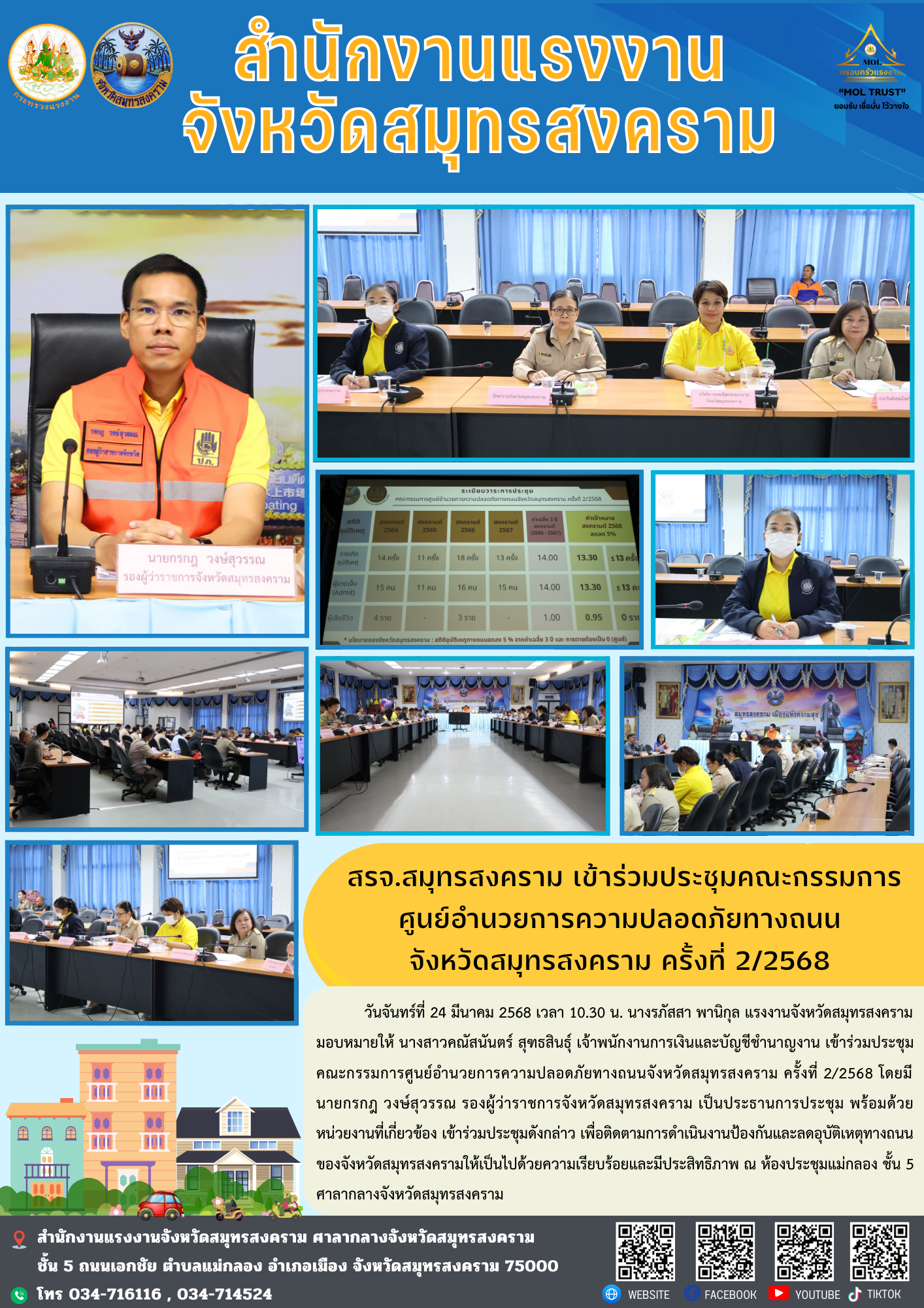 วันจันทร์ที่ 24 มีนาคม 2568 เวลา 10.30 น. นางรภัสสา พานิกุล แรงงานจังหวัดสมุทรสงคราม มอบหมายให้ นางสาวคณัสนันตร์ สุฑธสินธุ์ เจ้าพนักงานการเงินและบัญชีชำนาญงาน เข้าร่วมประชุมคณะกรรมการศูนย์อำนวยการความปลอดภัยทางถนนจังหวัดสมุทรสงคราม ครั้งที่ 2/2568 โดยมี นายกรกฎ วงษ์สุวรรณ รองผู้ว่าราชการจังหวัดสมุทรสงคราม เป็นประธานการประชุม พร้อมด้วยหน่วยงานที่เกี่ยวข้อง เข้าร่วมประชุมดังกล่าว เพื่อติดตามการดำเนินงานป้องกันและลดอุบัติเหตุทางถนนของจังหวัดสมุทรสงครามให้เป็นไปด้วยความเรียบร้อยและมีประสิทธิภาพ ณ ห้องประชุมแม่กลอง ชั้น 5 ศาลากลางจังหวัดสมุทรสงคราม