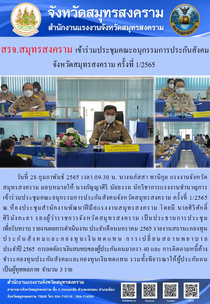 วันที่ 28 กุมภาพันธ์ 2565 เวลา 09.30 น. นางนภัสสา พานิกุล แรงงานจังหวัดสมุทรสงคราม มอบหมายให้ นางกัญญาศิริ นัยอรรถ นักวิชาการแรงงานชำนาญการ เข้าร่วมประชุมคณะอนุกรรมการประกันสังคมจังหวัดสมุทรสงคราม ครั้งที่ 1/2565 ณ ห้องประชุมสำนักงานพัฒนาฝีมือแรงงานสมุทรสงคราม โดยมี นายศิริศักดิ์ ศิริมังคะลา รองผู้ว่าราชการจังหวัดสมุทรสงคราม เป็นประธานการประชุม เพื่อรับทราบ รายงานผลการดำเนินงาน ประจำเดือนมกราคม 2565 รายงานสถานะกองทุนประกันสังคมและกองทุนเงินทดแทน การเปลี่ยนสถานพยาบาล ประจำปี 2565 การลดอัตราเงินสมทบของผู้ประกันตนมาตรา 40 และ การติดตามหนี้ค้างชำระกองทุนประกันสังคมและกองทุนเงินทดแทน รวมทั้งพิจารณาให้ผู้ประกันตนเป็นผู้ทุพพลภาพ จำนวน 3 ราย