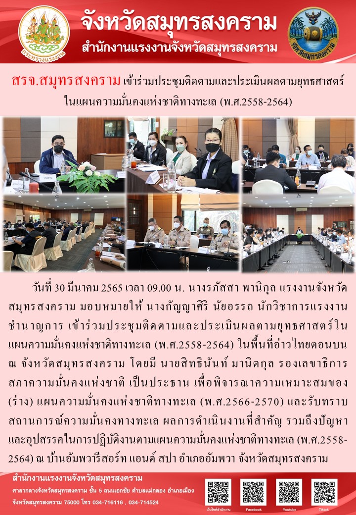 วันที่ 30 มีนาคม 2565 เวลา 09.00 น. นางรภัสสา พานิกุล แรงงานจังหวัดสมุทรสงคราม มอบหมายให้ นางกัญญาศิริ นัยอรรถ นักวิชาการแรงงานชำนาญการ เข้าร่วมประชุมติดตามและประเมินผลตามยุทธศาสตร์ในแผนความมั่นคงแห่งชาติทางทะเล (พ.ศ.2558-2564) ในพื้นที่อ่าวไทยตอนบน ณ จังหวัดสมุทรสงคราม โดยมี นายสิทธินันท์ มานิตกุล รองเลขาธิการสภาความมั่นคงแห่งชาติ เป็นประธาน เพื่อพิจารณาความเหมาะสมของ (ร่าง) แผนความมั่นคงแห่งชาติทางทะเล (พ.ศ.2566-2570) และรับทราบสถานการณ์ความมั่นคงทางทะเล ผลการดำเนินงานที่สำคัญ รวมถึงปัญหาและอุปสรรคในการปฏิบัติงานตามแผนความมั่นคงแห่งชาติทางทะเล (พ.ศ.2558-2564) ณ บ้านอัมพวารีสอร์ท แอนด์ สปา อำเภออัมพวา จังหวัดสมุทรสงคราม