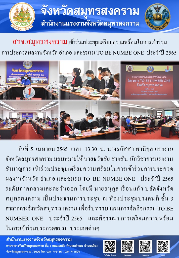 วันที่ 5 เมษายน 2565 เวลา 13.30 น. นางรภัสสา พานิกุล แรงงานจังหวัดสมุทรสงคราม มอบหมายให้ นายธวัชชัย ช่างสัน นักวิชาการแรงงานชำนาญการ เข้าร่วมประชุมเตรียมความพร้อมในการเข้าร่วมการประกวดผลงานจังหวัด อำเภอ และชมรม TO BE NUMBE ONE ประจำปี 2565 ระดับภาคกลางและตะวันออก โดยมี นายอนุกูล เรือนแก้ว ปลัดจังหวัดสมุทรสงคราม เป็นประธานการประชุม ณ ห้องประชุมบางคนที ชั้น 3 ศาลากลางจังหวัดสมุทรสงคราม เพื่อรับทราบ แผนการจัดกิจกรรม TO BE NUMBER ONE ประจำปี 2565 และพิจารณา การเตรียมความพร้อมในการเข้าร่วมประกวดชมรม ประเภทต่างๆ