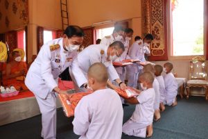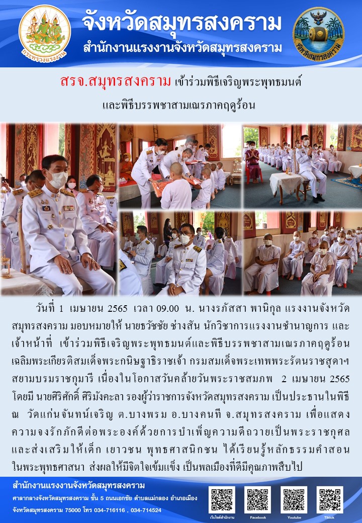 วันที่ 1 เมษายน 2565 เวลา 09.00 น. นางรภัสสา พานิกุล แรงงานจังหวัดสมุทรสงคราม มอบหมายให้ นายธวัชชัย ช่างสัน นักวิชาการแรงงานชำนาญการ และเจ้าหน้าที่ เข้าร่วมพิธีเจริญพระพุทธมนต์และพิธีบรรพชาสามเณรภาคฤดูร้อนเฉลิมพระเกียรติสมเด็จพระกนิษฐาธิราชเจ้า กรมสมเด็จพระเทพพระรัตนราชสุดาฯ สยามบรมราชกุมารี เนื่องในโอกาสวันคล้ายวันพระราชสมภพ 2 เมษายน 2565 โดยมี นายศิริศักดิ์ ศิริมังคะลา รองผู้ว่าราชการจังหวัดสมุทรสงคราม เป็นประธานในพิธี ณ วัดแก่นจันทน์เจริญ ต.บางพรม อ.บางคนที จ.สมุทรสงคราม เพื่อแสดงความจงรักภักดีต่อพระองค์ด้วยการบำเพ็ญความดีถวายเป็นพระราชกุศลและส่งเสริมให้เด็ก เยาวชน พุทธศาสนิกชน ได้เรียนรู้หลักธรรมคำสอนในพระพุทธศาสนา ส่งผลให้มีจิตใจเข้มแข็ง เป็นพลเมืองที่ดีมีคุณภาพสืบไป
