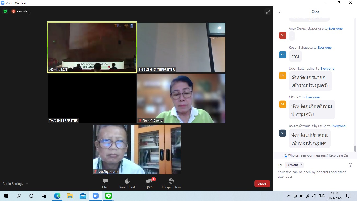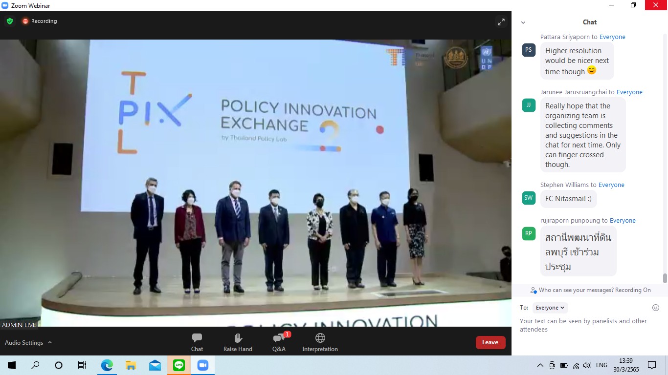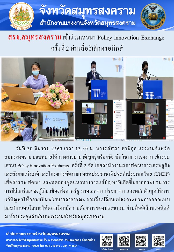 วันที่ 30 มีนาคม 2565 เวลา 13.30 น. นางรภัสสา พานิกุล แรงงานจังหวัดสมุทรสงคราม มอบหมายให้ นางสาวปานวดี สุขรุ่งเรืองชัย นักวิชาการแรงงาน เข้าร่วมเสวนา Policy innovation Exchange ครั้งที่ 2 จัดโดยสำนักงานสภาพัฒนาการเศรษฐกิจและสังคมแห่งชาติ และโครงการพัฒนาแห่งสหประชาชาติประจำประเทศไทย (UNDP) เพื่อสำรวจ พัฒนา และทดลองชุดแนวทางการแก้ปัญหาที่เกิดขึ้นจากกระบวนการการมีส่วนร่วมของผู้เกี่ยวข้องทั้งภาครัฐ ภาคเอกชน ประชาชน และผลักดันชุดวิธีการแก้ปัญหาให้กลายเป็นนโยบายสาธารณะ รวมถึงเปลี่ยนแปลงกระบวนการออกแบบและกำหนดนโยบายให้ตอบโจทย์ความต้องการของประชาชน ผ่านสื่ออิเล็กทรอนิกส์ ณ ห้องประชุมสำนักงานแรงงานจังหวัดสมุทรสงคราม