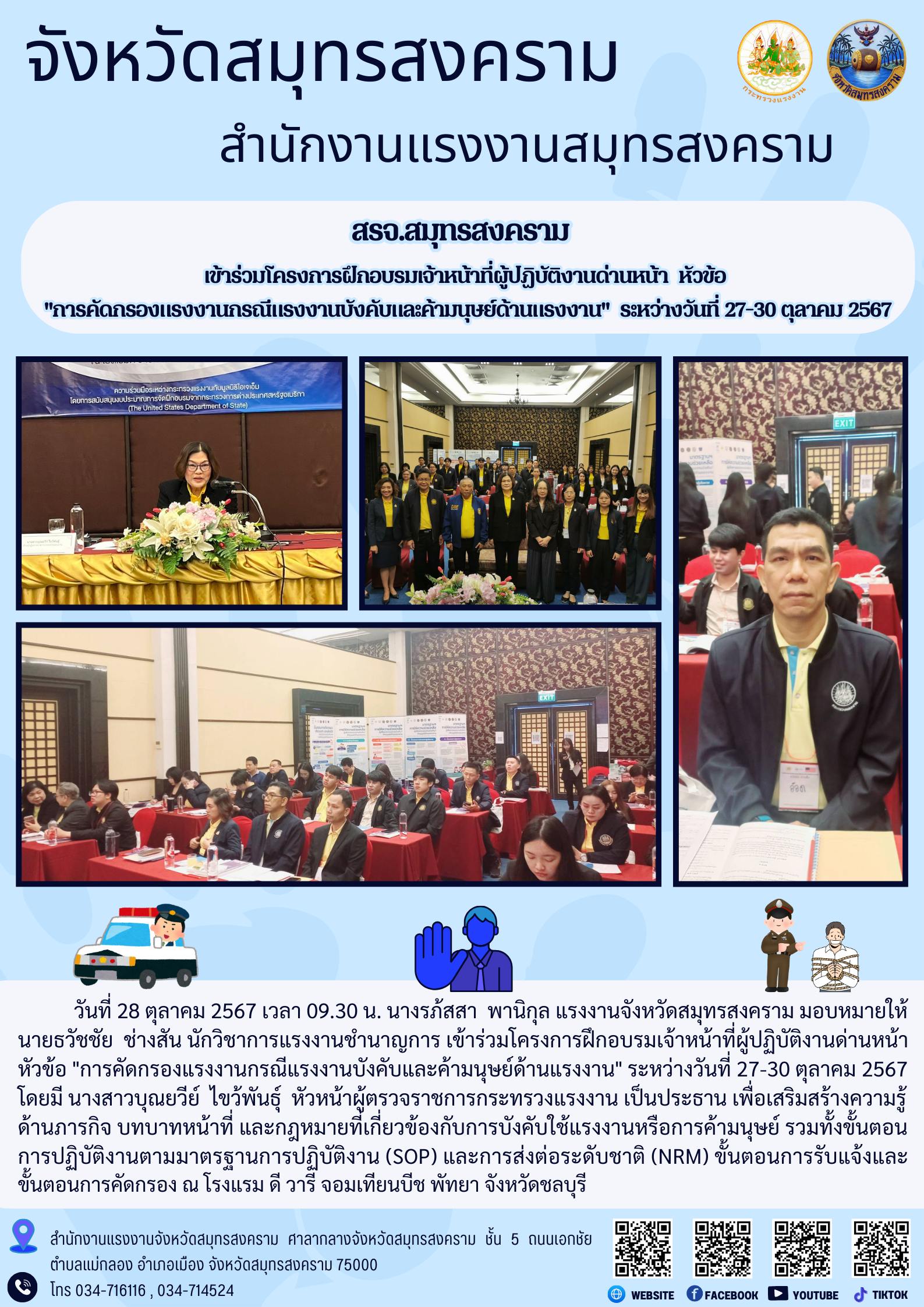 วันที่ 28 ตุลาคม 2567 เวลา 09.30 น. นางรภ้สสา พานิกุล แรงงานจังหวัดสมุทรสงคราม มอบหมายให้นายธวัชชัย ช่างสัน นักวิชาการแรงงานชำนาญการ เข้าร่วมโครงการฝึกอบรมเจ้าหน้าที่ผู้ปฏิบัติงานด่านหน้า หัวข้อ “การคัดกรองแรงงานกรณีแรงงานบังคับและค้ามนุษย์ด้านแรงงาน” ระหว่างวันที่ 27-30 ตุลาคม 2567 โดยมี นางสาวบุณยวีย์ ไขว้พันธุ์ หัวหน้าผู้ตรวจราชการกระทรวงแรงงาน เป็นประธาน เพื่อเสริมสร้างความรู้ด้านภารกิจ บทบาทหน้าที่ และกฎหมายที่เกี่ยวข้องกับการบังคับใช้แรงงานหรือการค้ามนุษย์ รวมทั้งขั้นตอนการปฏิบัติงานตามมาตรฐานการปฏิบัติงาน (SOP) และการส่งต่อระดับชาติ (NRM) ขั้นตอนการรับแจ้งและขั้นตอนการคัดกรอง ณ โรงแรม ดี วารี จอมเทียนบีช พัทยา จังหวัดชลบุรี