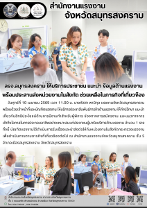 วันศุกร์ที่ 10 เมษายน 2569 เวลา 11.00 น. นางภัสสา พานิกุล แรงงานจังหวัดสมุทรสงคราม พร้อมด้วยเจ้าหน้าที่และบัณฑิตแรงงาน ให้บริการประชาสัมพันธ์ภารกิจด้านแรงงาน ให้คำปรึกษา แนะนำ เกี่ยวกับสิทธิประโยชน์ด้านการมีงานทำสำหรับผู้พิการ ช่องทางการสมัครงาน และแนวทางการ เข้าถึงโอกาสในการประกอบอาชีพอย่างเหมาะสมแก่ประชาชนผู้มารับบริการด้านแรงงาน จำนวน 1 ราย ทั้งนี้ บัณฑิตแรงงานได้ดำเนินการรับเรื่องและนำส่งต่อให้กับหน่วยงานในสังกัดกระทรวงแรงงาน เพื่อดำเนินการตามภารกิจที่เกี่ยวข้องต่อไป ณ สำนักงานแรงงานจังหวัดสมุทรสงคราม ชั้น 5 อำเภอเมืองสมุทรสงคราม จังหวัดสมุทรสงคราม