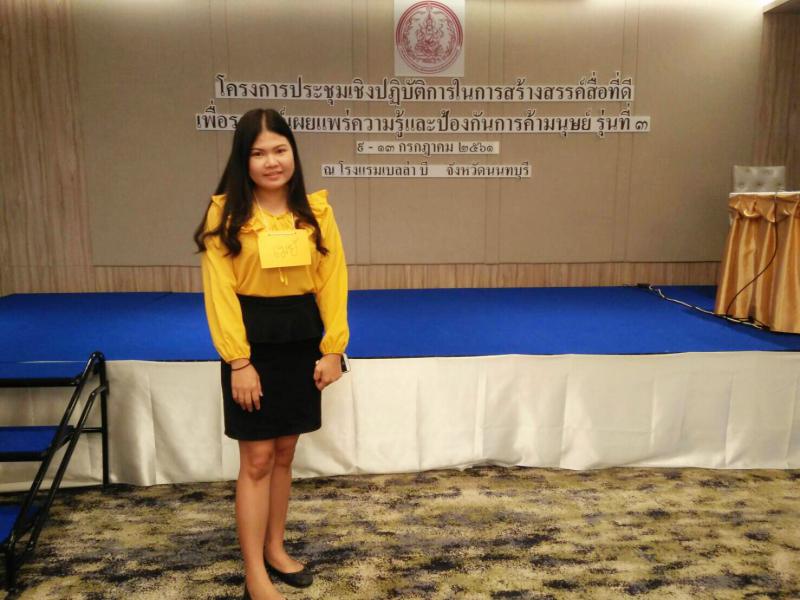 นางสาวรัตนา ทองกลับ แรงงานจังหวัดสระบุรี มอบหมายให้นางสาวจุฬารัตน์ บรรพต เจ้าหน้าที่วิเคราะห์ดัชนีชี้วัดภาวะแรงงานฯ เข้าร่วมโครงการประชุมเชิงปฏิบัติการในการสร้างสรรค์สื่อที่ดีเพื่อรณรงค์เผยแพร่ความรู้และป้องกันการค้ามนุษย์ ประจำปี 2561 รุ่นที่ 3 ซึ่งจัดโดยกระทรวงพัฒนาสังคมและความมั่นคงของมนุษย์ ระหว่างวันที่ 9-13 กรกฎาคม 2561 ณ โรงแรมเบลล่า บี (Bella B Hotel) จังหวัดนนทบุรี