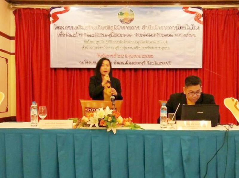 วันที่ 25 มิถุนายน 2562 เวลา 08.30 น. นางสาวรัตนา ทองกลับ แรงงานจังหวัดสระบุรี มอบหมายให้นายอรรถพล ขันธวิธิ นักวิชาการแรงงานชำนาญการ และนางสาวจันทิรา เพ็ชรพราว เจ้าหน้าที่บริการ เข้าร่วมอบรมโครงการเสริมสร้างเกียรติภูมิข้าราชการ : สำนึกข้าราชการไทยไม่โกง เพื่อร่วมสร้าง “จังหวัดสระบุรี ใสสะอาด” ประจำปีงบประมาณ พ.ศ. 2562 เพื่อเสริมสร้างความรู้ความเข้าใจส่งเสริมจริยธรรมของหน่วยงาน โดยมีนายเกียรติศักดิ์ ตรงศิริ รองผู้ว่าราชการจังหวัดสระบุรี เป็นประธาน ณ ห้องบอลรูม โรงแรมเกี่ยวอัน จังหวัดสระบุรี