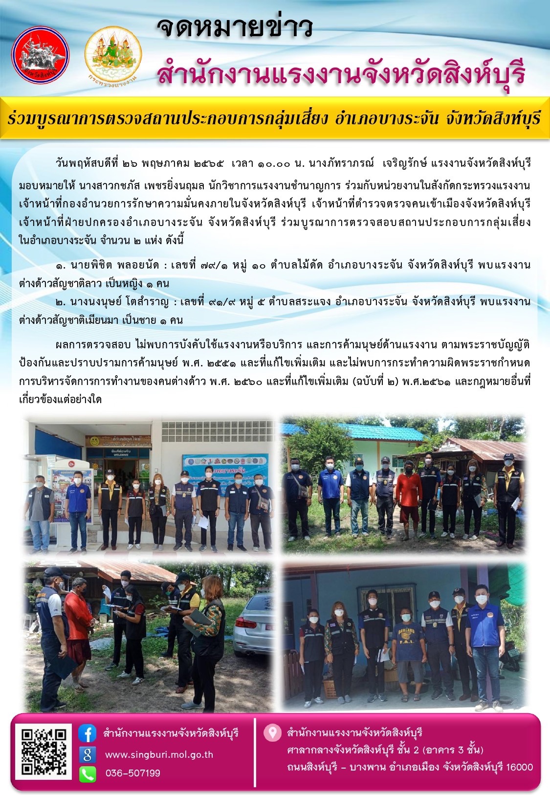 สรจ.สิงห์บุรี ร่วมบูรณาการตรวจสถานประกอบการกลุ่มเสี่ยง อำเภอบางระจัน จังหวัดสิงห์บุรี