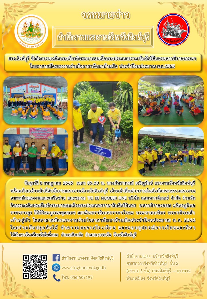 สรจ.สิงห์บุรี จัดกิจกรรมเฉลิมพระเกียรติพระบาทสมเด็จพระปรเมนทรรามาธิบดีศรีสินทรมหาวชิราลงกรณฯ โดยอาสาสมัครแรงงานร่วมใจอาสาพัฒนาบ้านเกิด ประจำปีงบประมาณ พ.ศ.2565