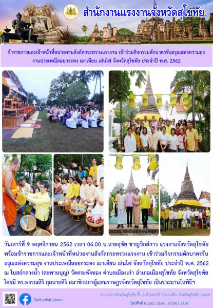 สรจ.สุโขทัย พร้อมข้าราชการและเจ้าหน้าที่หน่วยงานสังกัดกระทรวงแรงงาน เข้าร่วมกิจกรรมตักบาตรรับอรุณแห่งความสุข งานประเพณีลอยกระทง เผาเทียน เล่นไฟ จังหวัดสุโขทัย ประจำปี พ.ศ. 2562