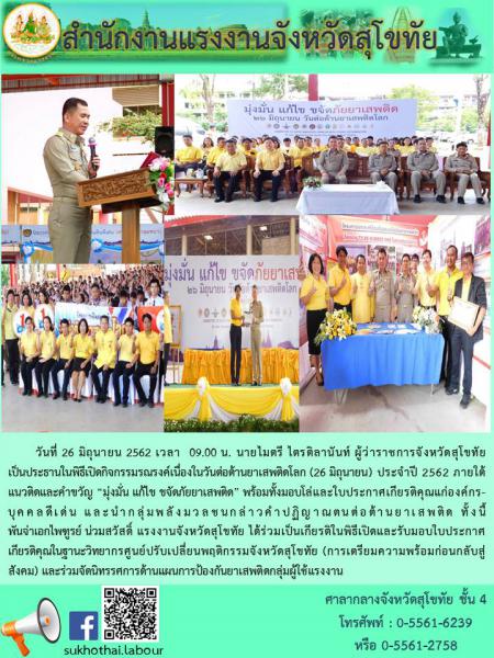 สรจ.สุโขทัย ร่วมกิจกรรมรณรงค์เนื่องในวันต่อต้านยาเสพติดโลก (26 มิถุนายน) ประจำปี 2562 ภายใต้แนวคิดและคำขวัญ “มุ่งมั่น แก้ไข ขจัดภัยยาเสพติด”