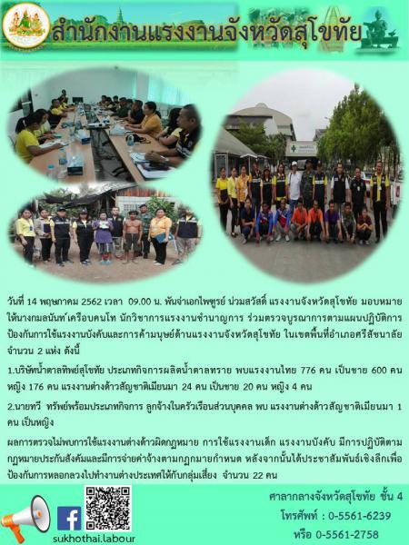 สรจ.สุโขทัย ร่วมตรวจบูรณาการตามแผนปฏิบัติการป้องกันการใช้แรงงานบังคับและการค้ามนุษย์ด้านแรงงานจังหวัดสุโขทัย