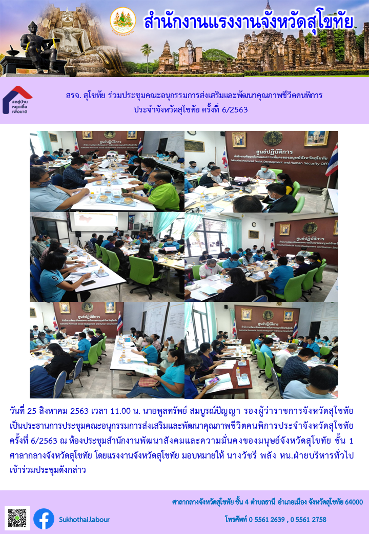 สรจ สุโขทัย ร่วมประชุมคณะอนุกรรมการส่งเสริมและพัฒนาคุณภาพชีวิตคนพิการประจำจังหวัดสุโขทัย ครั้งที่ 6/2563