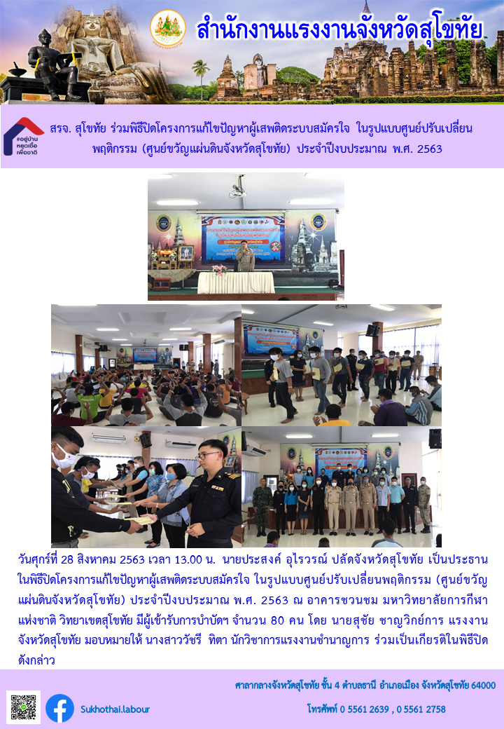 สรจ. สุโขทัย ร่วมพิธีปิดโครงการแก้ไขปัญหาผู้เสพติดระบบสมัครใจ ในรูปแบบศูนย์ปรับเปลี่ยนพฤติกรรม (ศูนย์ขวัญแผ่นดินจังหวัดสุโขทัย) ประจำปีงบประมาณ พ.ศ. 2563