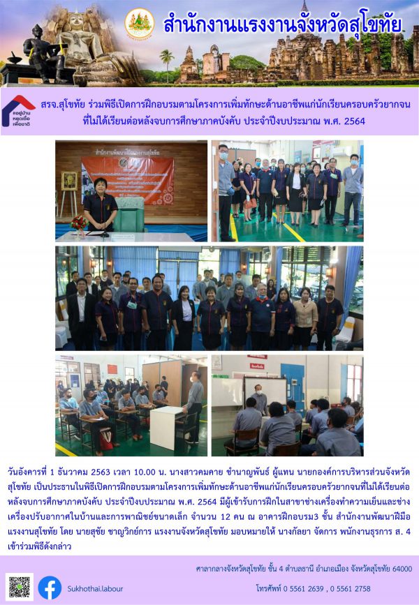 สรจ.สุโขทัย ร่วมพิธีเปิดการฝึกอบรมตามโครงการเพิ่มทักษะด้านอาชีพแก่นักเรียนครอบครัวยากจนที่ไม่ได้เรียนต่อหลังจบการศึกษาภาคบังคับ ประจำปีงบประมาณ พ.ศ. 2564