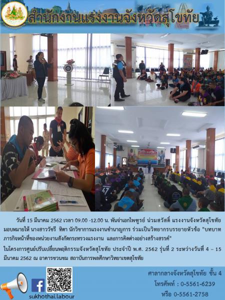 สรจ.สุโขทัย ร่วมเป็นวิทยากรบรรยายหัวข้อ “บทบาทภารกิจหน้าที่ของหน่วยงานสังกัดกระทรวงแรงงาน และการคิดต่างอย่างสร้างสรรค์” ในโครงการศูนย์ปรับเปลี่ยนพฤติกรรมจังหวัดสุโขทัย ประจำปี พ.ศ. 2562 รุ่นที่ 2