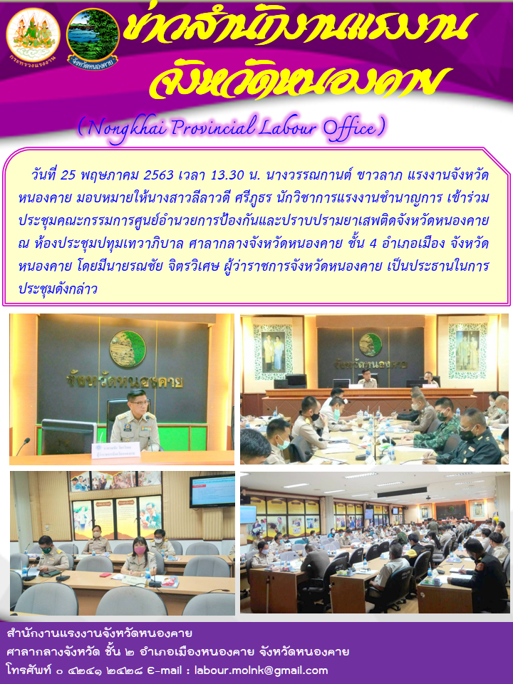 วันที่ 25 พฤษภาคม 2563 เวลา 13.30 น. นางวรรณกานต์ ขาวลาภ แรงงานจังหวัดหนองคาย มอบหมายให้นางสาวลีลาวดี ศรีภูธร นักวิชาการแรงงานชำนาญการ เข้าร่วมประชุมคณะกรรมการศูนย์อำนวยการป้องกันและปราบปรามยาเสพติดจังหวัดหนองคาย ณ ห้องประชุมปทุมเทวาภิบาล ศาลากลางจังหวัดหนองคาย ชั้น 4 อำเภอเมือง จังหวัดหนองคาย โดยมีนายรณชัย จิตรวิเศษ ผู้ว่าราชการจังหวัดหนองคาย เป็นประธานในการประชุมดังกล่าว