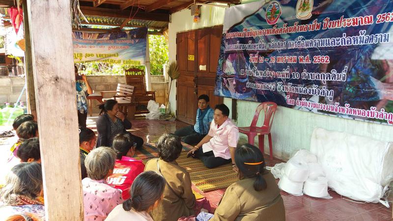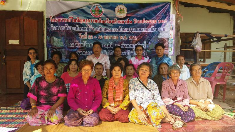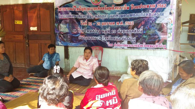 วันอังคารที่ 22 มกราคม 2561 เวลา 10.00 น. นายอำนาจ เชิงไว แรงงานจังหวัดหนองบัวลำภู เป็นประธานเปิดโครงการ แก้ไขปัญหา ความเดือดร้อนด้านอาชีพ ปีงบประมาณ 2562 กิจกรรมพัฒนาทักษะฝีมือหลักสูตร"การย้อมครามและก่อหม้อคราม "ระหว่างวันที่ 22-26 มกราคม 2562 ระยะเวลา 5 วัน ณ บ้านโนนสว่าง หมู่ที่ 10 ตำบลกุดดินจี่ อำเภอนากลาง จังหวัดหนองบัวลำภู โดย… นางสาวเมตตา อุดมคำ ผู้ช่วยแรงงานจังหวัดหนองบัวลำภู ชี้แจงรายละเอียดการฝึกอบรม