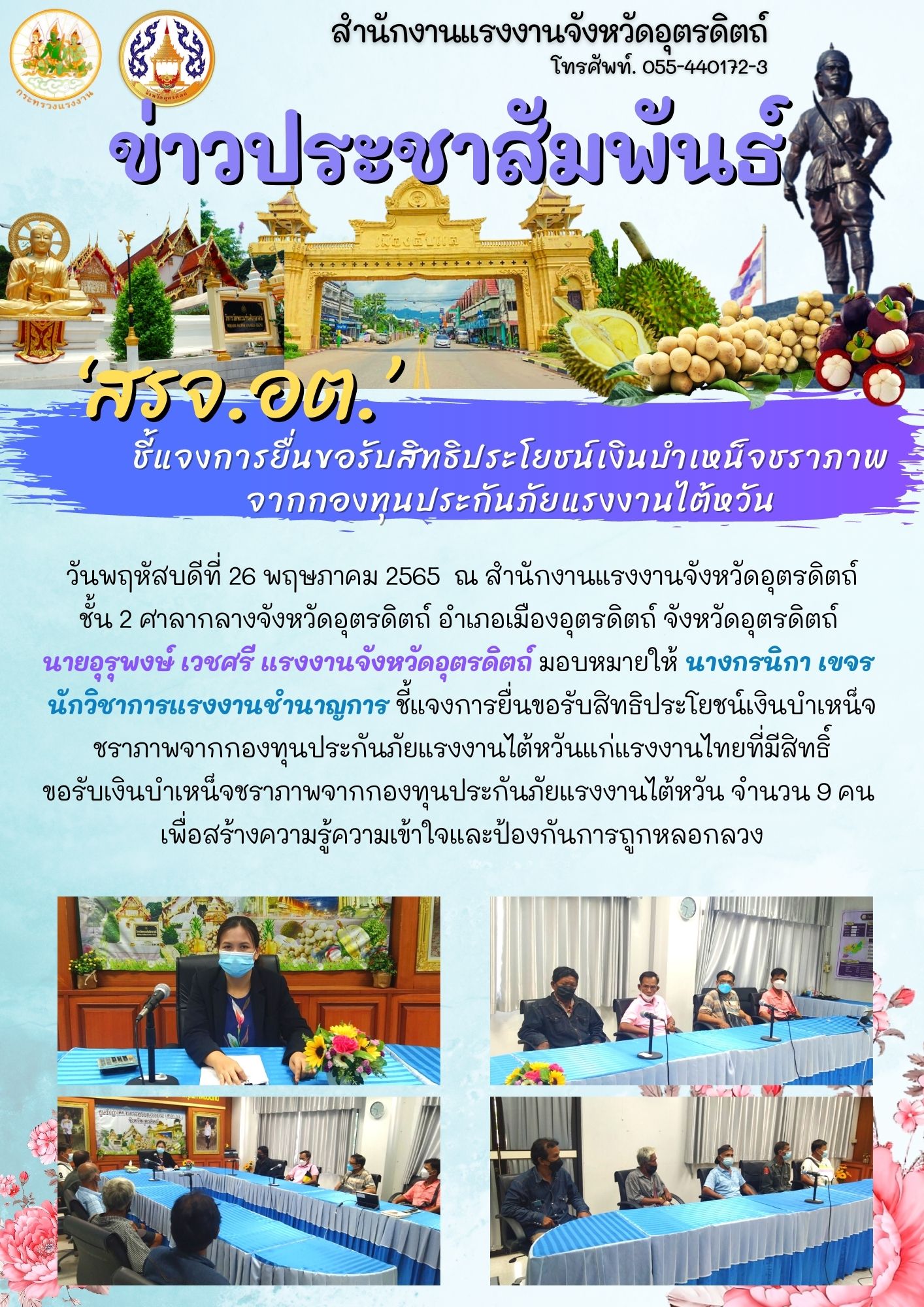 วันพฤหัสบดีที่ 26 พฤษภาคม 2565 ณ สำนักงานแรงงานจังหวัดอุตรดิตถ์ ชั้น 2 ศาลากลางจังหวัดอุตรดิตถ์ อำเภอเมืองอุตรดิตถ์ จังหวัดอุตรดิตถ์ นายอุรุพงษ์ เวชศรี แรงงานจังหวัดอุตรดิตถ์ มอบหมายให้ นางกรนิกา เขจร นักวิชาการแรงงานชำนาญการ ชี้แจงการยื่นขอรับสิทธิประโยชน์เงินบำเหน็จชราภาพจากกองทุนประกันภัยแรงงานไต้หวันแก่แรงงานไทยที่มีสิทธิ์ ขอรับเงินบำเหน็จชราภาพจากกองทุนประกันภัยแรงงานไต้หวัน จำนวน 9 คน เพื่อสร้างความรู้ความเข้าใจและป้องกันการถูกหลอกลวง