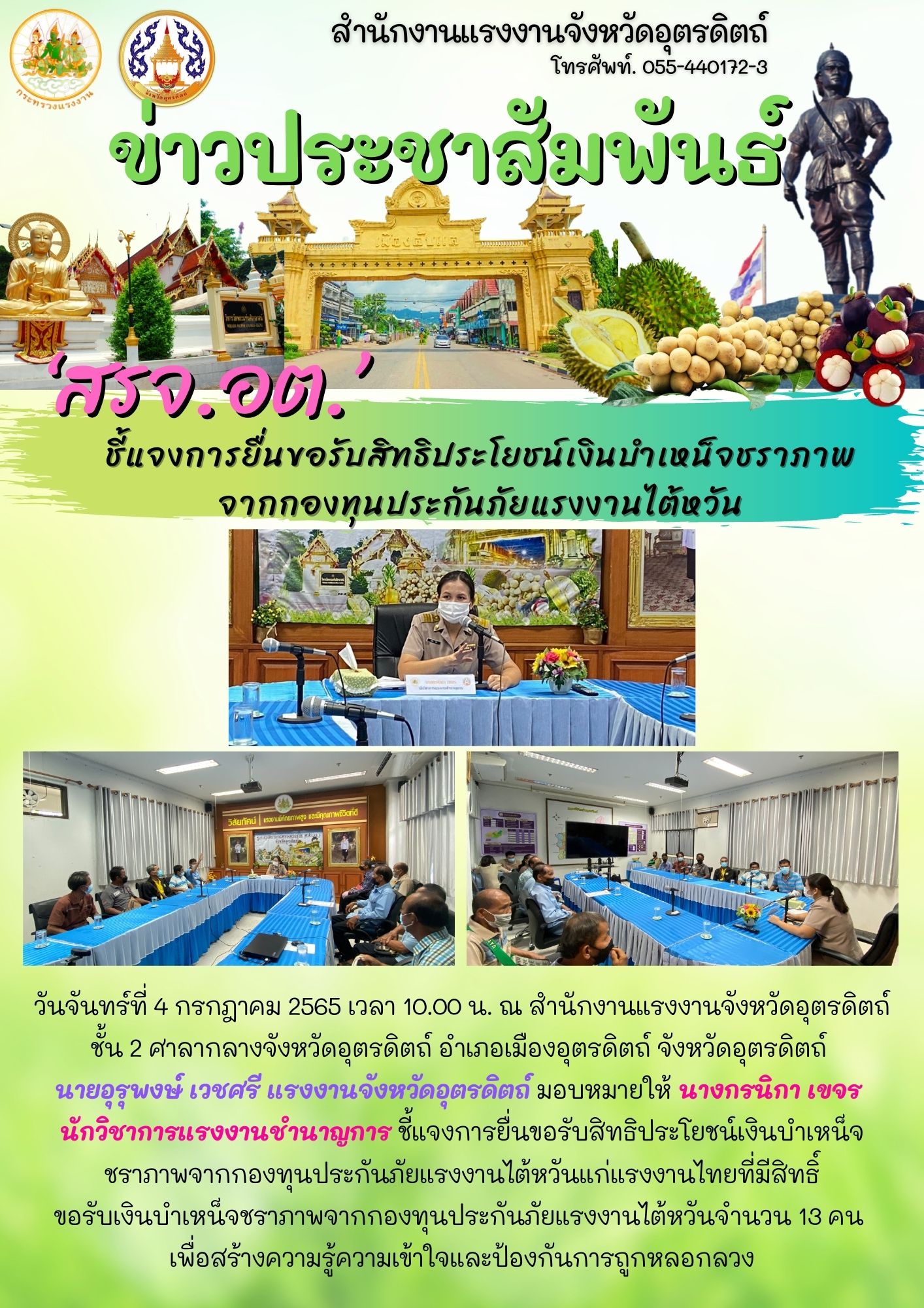 วันจันทร์ที่ 4 กรกฎาคม 2565 เวลา 10.00 น. ณ สำนักงานแรงงานจังหวัดอุตรดิตถ์ ชั้น 2 ศาลากลางจังหวัดอุตรดิตถ์ อำเภอเมืองอุตรดิตถ์ จังหวัดอุตรดิตถ์ นายอุรุพงษ์ เวชศรี แรงงานจังหวัดอุตรดิตถ์ มอบหมายให้ นางกรนิกา เขจร นักวิชาการแรงงานชำนาญการ ชี้แจงการยื่นขอรับสิทธิประโยชน์เงินบำเหน็จชราภาพจากกองทุนประกันภัยแรงงานไต้หวันแก่แรงงานไทยที่มีสิทธิ์ ขอรับเงินบำเหน็จชราภาพจากกองทุนประกันภัยแรงงานไต้หวันจำนวน 13 คน เพื่อสร้างความรู้ความเข้าใจและป้องกันการถูกหลอกลวง
