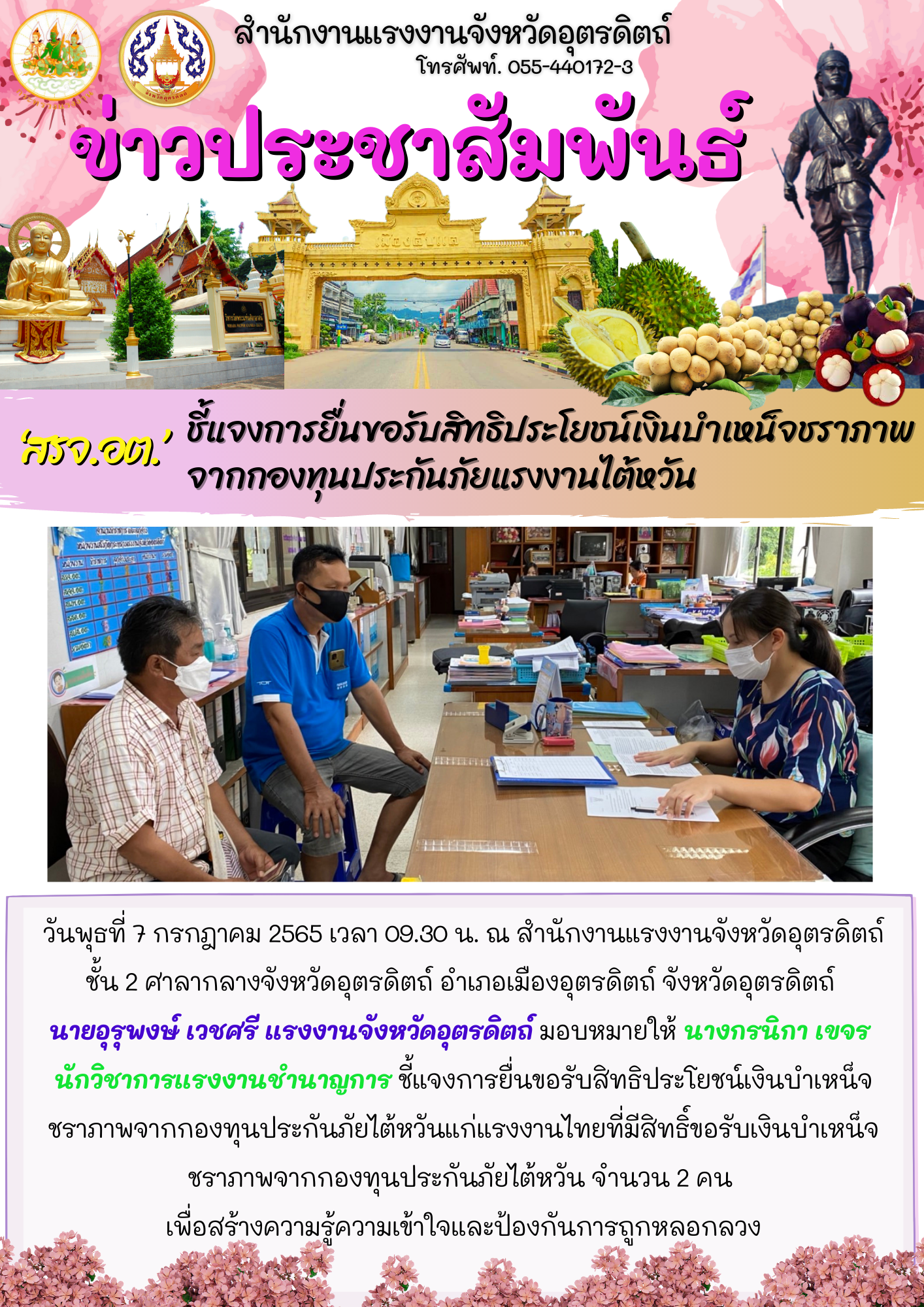 วันพุธที่ 7 กรกฎาคม 2565 เวลา 09.30 น. ณ สำนักงานแรงงานจังหวัดอุตรดิตถ์ ชั้น 2 ศาลากลางจังหวัดอุตรดิตถ์ อำเภอเมืองอุตรดิตถ์ จังหวัดอุตรดิตถ์ นายอุรุพงษ์ เวชศรี แรงงานจังหวัดอุตรดิตถ์ มอบหมายให้ นางกรนิกา เขจร นักวิชาการแรงงานชำนาญการ ชี้แจงการยื่นขอรับสิทธิประโยชน์เงินบำเหน็จชราภาพจากกองทุนประกันภัยไต้หวันแก่แรงงานไทยที่มีสิทธิ์ขอรับเงินบำเหน็จชราภาพจากกองทุนประกันภัยไต้หวัน จำนวน 2 คน เพื่อสร้างความรู้ความเข้าใจและป้องกันการถูกหลอกลวง