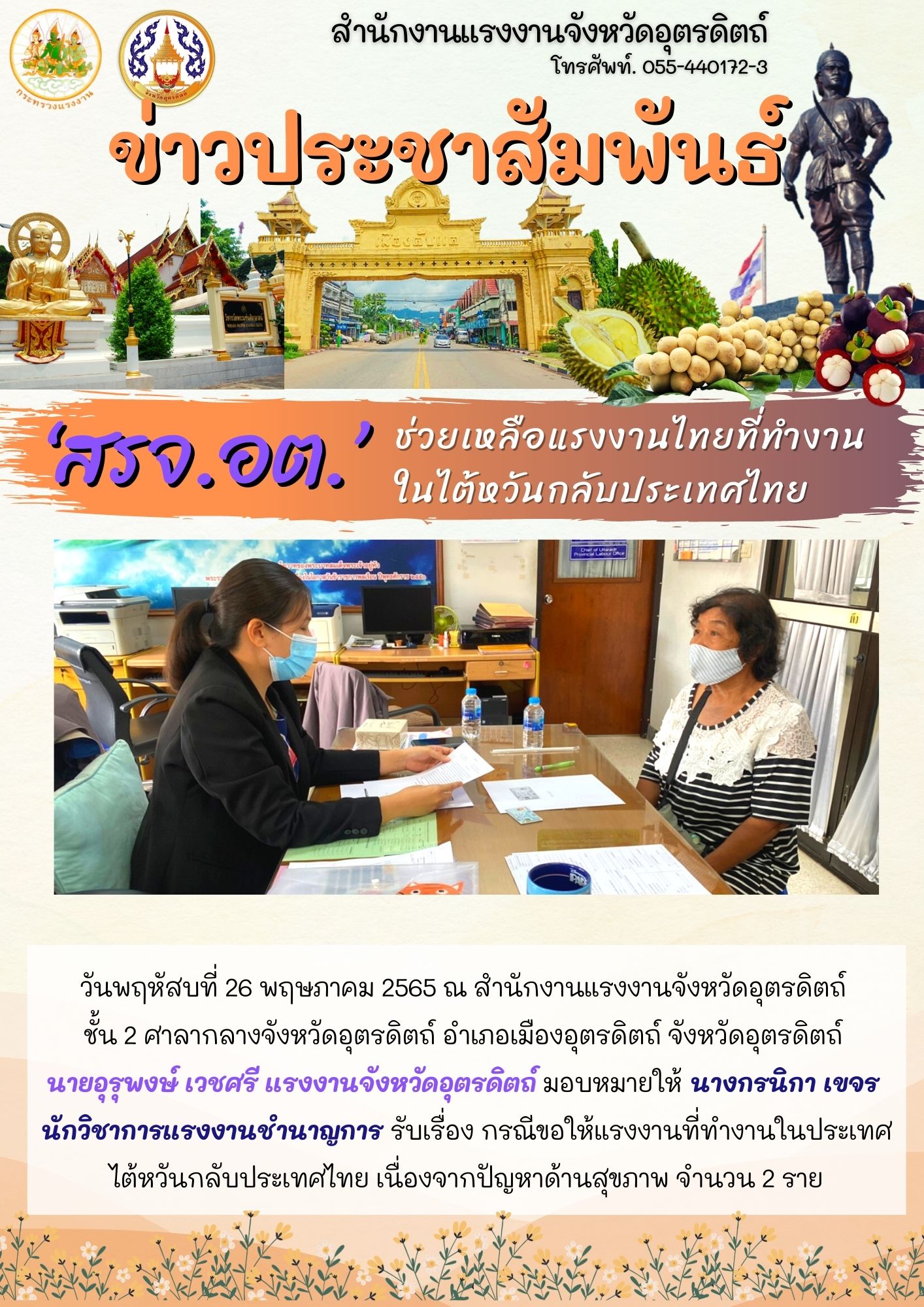 วันพฤหัสบที่ 26 พฤษภาคม 2565 ณ สำนักงานแรงงานจังหวัดอุตรดิตถ์ ชั้น 2 ศาลากลางจังหวัดอุตรดิตถ์ อำเภอเมืองอุตรดิตถ์ จังหวัดอุตรดิตถ์ นายอุรุพงษ์ เวชศรี แรงงานจังหวัดอุตรดิตถ์ มอบหมายให้ นางกรนิกา เขจร นักวิชาการแรงงานชำนาญการ รับเรื่อง กรณีขอให้แรงงานที่ทำงานในประเทศไต้หวันกลับประเทศไทย เนื่องจากปัญหาด้านสุขภาพ จำนวน 2 ราย