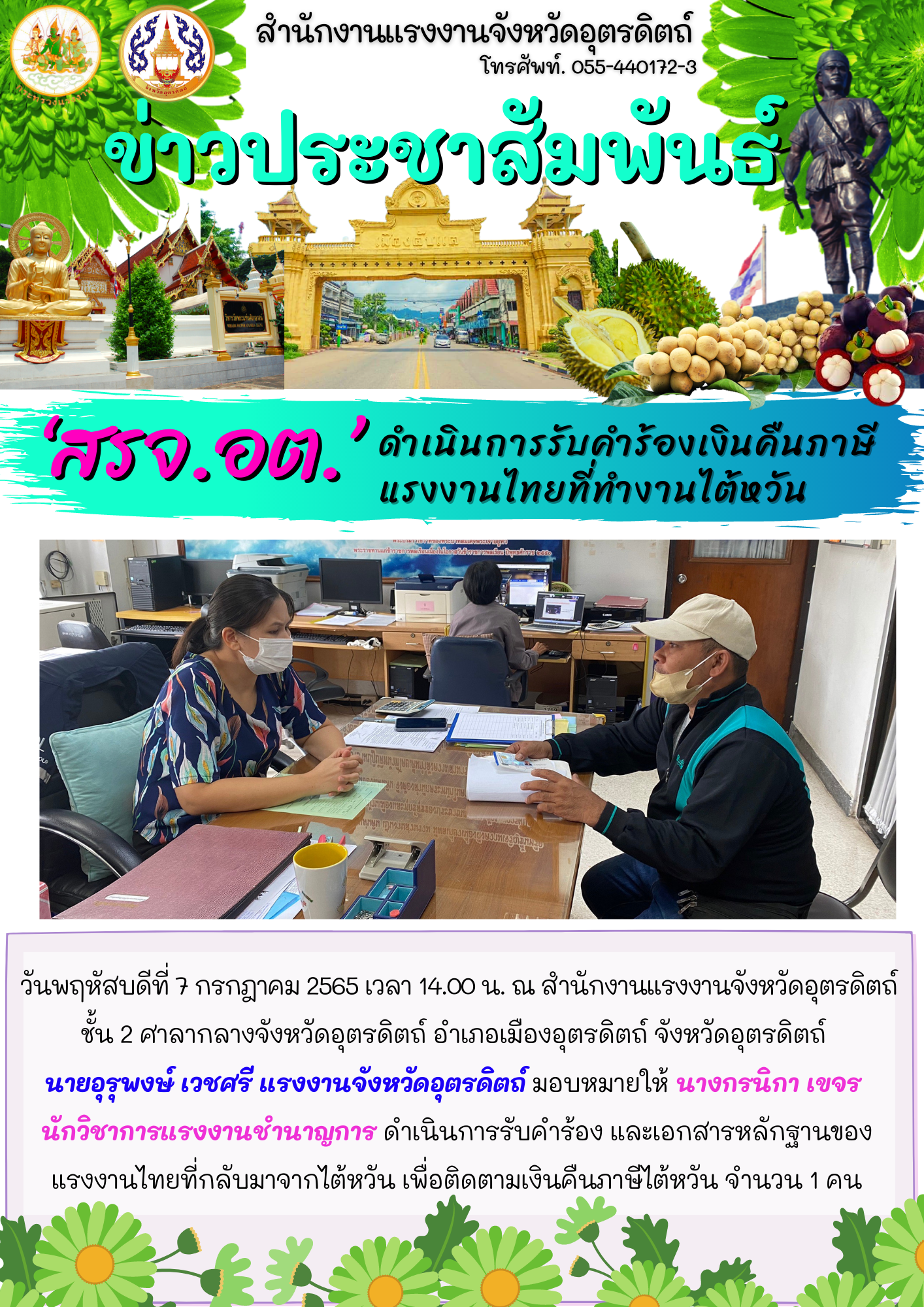 วันพฤหัสบดีที่ 7 กรกฎาคม 2565 เวลา 14.00 น. ณ สำนักงานแรงงานจังหวัดอุตรดิตถ์ ชั้น 2 ศาลากลางจังหวัดอุตรดิตถ์ อำเภอเมืองอุตรดิตถ์ จังหวัดอุตรดิตถ์ นายอุรุพงษ์ เวชศรี แรงงานจังหวัดอุตรดิตถ์ มอบหมายให้ นางกรนิกา เขจร นักวิชาการแรงงานชำนาญการ ดำเนินการรับคำร้อง และเอกสารหลักฐานของแรงงานไทยที่กลับมาจากไต้หวัน เพื่อติดตามเงินคืนภาษีไต้หวัน จำนวน 1 คน