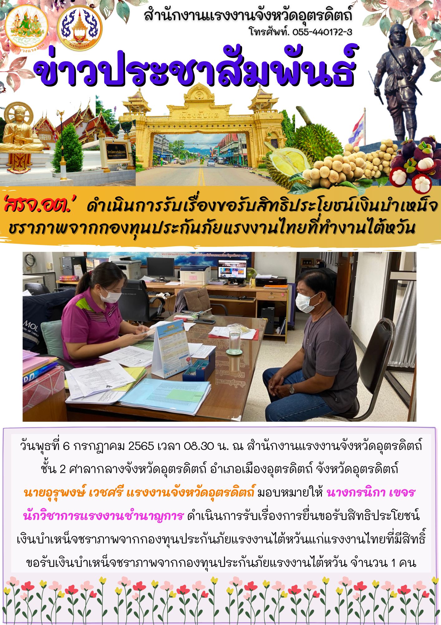 วันพุธที่ 6 กรกฎาคม 2565 เวลา 08.30 น. ณ สำนักงานแรงงานจังหวัดอุตรดิตถ์ ชั้น 2 ศาลากลางจังหวัดอุตรดิตถ์ อำเภอเมืองอุตรดิตถ์ จังหวัดอุตรดิตถ์ นายอุรุพงษ์ เวชศรี แรงงานจังหวัดอุตรดิตถ์ มอบหมายให้ นางกรนิกา เขจร นักวิชาการแรงงานชำนาญการ ดำเนินการรับเรื่องการยื่นขอรับสิทธิประโยชน์เงินบำเหน็จชราภาพจากกองทุนประกันภัยแรงงานไต้หวันแก่แรงงานไทยที่มีสิทธิ์ขอรับเงินบำเหน็จชราภาพจากกองทุนประกันภัยแรงงานไต้หวัน จำนวน 1 คน