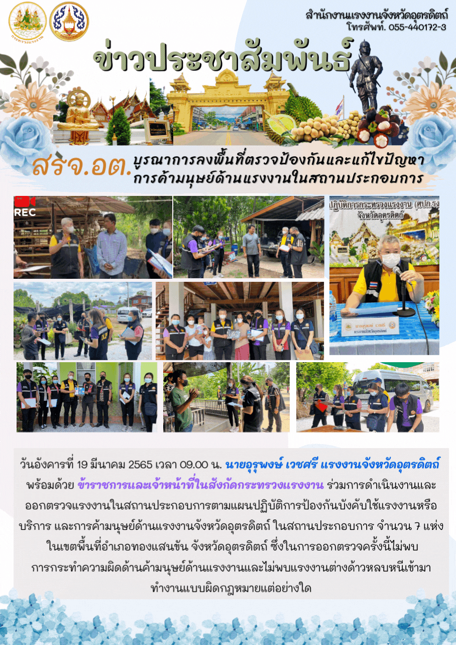 สรจ.อุตรดิตถ์ บูรณาการลงพื้นที่ตรวจป้องกันและแก้ไขปัญหาการค้ามนุษย์ด้านแรงงานในสถานประกอบการ วันอังคารที่ 19 มีนาคม 2565 เวลา 08.30 น. นายอุรุพงษ์ เวชศรี แรงงานจังหวัดอุตรดิตถ์ พร้อมด้วย ข้าราชการและเจ้าหน้าที่ในสังกัดกระทรวงแรงงาน ร่วมการดำเนินงานและออกตรวจแรงงานในสถานประกอบการตามแผนปฏิบัติการป้องกันบังคับใช้แรงงานหรือบริการ และการค้ามนุษย์ด้านแรงงานจังหวัดอุตรดิตถ์ ในสถานประกอบการ จำนวน 7 แห่งในเขตพื้นที่อำเภอทองแสนขัน จังหวัดอุตรดิตถ์ ซึ่งในการออกตรวจครั้งนี้ไม่พบการกระทำความผิดด้านค้ามนุษย์ด้านแรงงานและไม่พบแรงงานต่างด้าวหลบหนีเข้ามาทำงานแบบผิดกฎหมายแต่อย่างใด