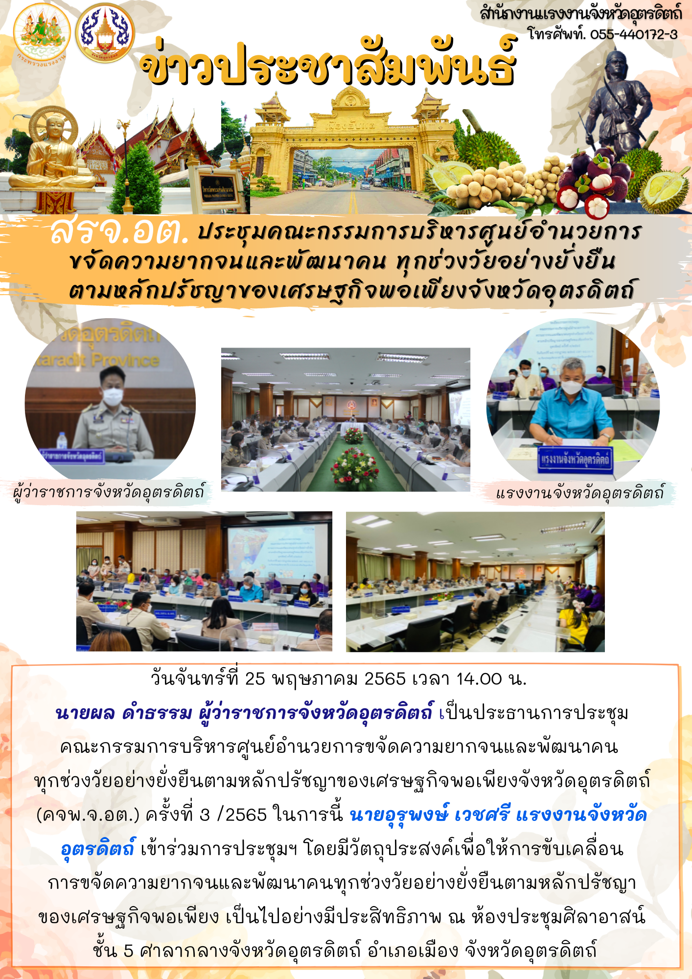 วันจันทร์ที่ 25 พฤษภาคม 2565 เวลา 14.00 น. นายผล ดำธรรม ผู้ว่าราชการจังหวัดอุตรดิตถ์ เป็นประธานการประชุมคณะกรรมการบริหารศูนย์อำนวยการขจัดความยากจนและพัฒนาคนทุกช่วงวัยอย่างยั่งยืนตามหลักปรัชญาของเศรษฐกิจพอเพียงจังหวัดอุตรดิตถ์ (คจพ.จ.อต.) ครั้งที่ 3 /2565 ในการนี้ นายอุรุพงษ์ เวชศรี แรงงานจังหวัดอุตรดิตถ์ เข้าร่วมการประชุมฯ โดยมีวัตถุประสงค์เพื่อให้การขับเคลื่อนการขจัดความยากจนและพัฒนาคนทุกช่วงวัยอย่างยั่งยืนตามหลักปรัชญาของเศรษฐกิจพอเพียง เป็นไปอย่างมีประสิทธิภาพ ณ ห้องประชุมศิลาอาสน์ ชั้น 5 ศาลากลางจังหวัดอุตรดิตถ์ อำเภอเมือง จังหวัดอุตรดิตถ์