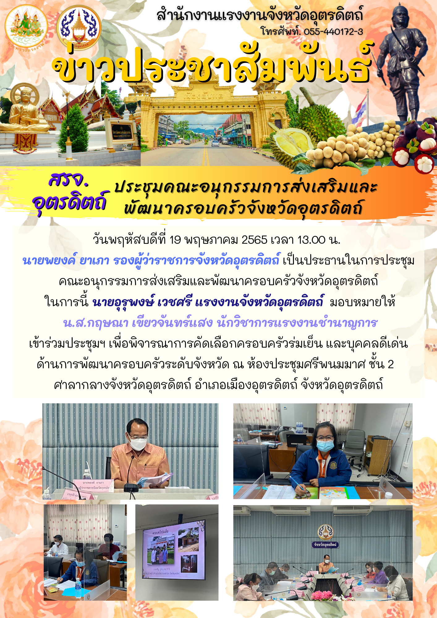 วันพฤหัสบดีที่ 19 พฤษภาคม 2565 เวลา 13.00 น. นายพยงค์ ยาเภา รองผู้ว่าราชการจังหวัดอุตรดิตถ์ เป็นประธานในการประชุมคณะอนุกรรมการส่งเสริมและพัฒนาครอบครัวจังหวัดอุตรดิตถ์ ในการนี้ นายอุรุพงษ์ เวชศรี แรงงานจังหวัดอุตรดิตถ์ มอบหมายให้ น.ส.กฤษณา เขียวจันทร์แสง นักวิชาการแรงงานชำนาญการเข้าร่วมประชุมฯ เพื่อพิจารณาการคัดเลือกครอบครัวร่มเย็น และบุคคลดีเด่นด้านการพัฒนาครอบครัวระดับจังหวัด ณ ห้องประชุมศรีพนมมาศ ชั้น 2 ศาลากลางจังหวัดอุตรดิตถ์ อำเภอเมืองอุตรดิตถ์ จังหวัดอุตรดิตถ์