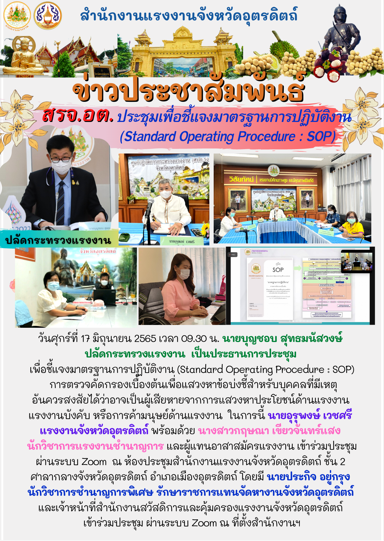 วันศุกร์ที่ 17 มิถุนายน 2565 เวลา 09.30 น. นายบุญชอบ สุทธมนัสวงษ์ ปลัดกระทรวงแรงงาน เป็นประธานการประชุม เพื่อชี้แจงมาตรฐานการปฏิบัติงาน (Standard Operating Procedure : SOP) การตรวจคัดกรองเบื้องต้นเพื่อแสวงหาข้อบ่งชี้สำหรับบุคคลที่มีเหตุอันควรสงสัยได้ว่าอาจเป็นผู้เสียหายจากการแสวงหาประโยชน์ด้านแรงงาน แรงงานบังคับ หรือการค้ามนุษย์ด้านแรงงาน ในการนี้ นายอุรุพงษ์ เวชศรี แรงงานจังหวัดอุตรดิตถ์ พร้อมด้วย นางสาวกฤษณา เขียวจันทร์แสง นักวิชาการแรงงานชำนาญการ และผู้แทนอาสาสมัครแรงงาน เข้าร่วมประชุมผ่านระบบ Zoom ณ ห้องประชุมสำนักงานแรงงานจังหวัดอุตรดิตถ์ ชั้น 2 ศาลากลางจังหวัดอุตรดิตถ์ อำเภอเมืองอุตรดิตถ์ โดยมีนายประกิจ อยู่กรุง นักวิชาการชำนาญการพิเศษ รักษาราชการแทนจัดหางานจังหวัดอุตรดิตถ์ และเจ้าหน้าที่สำนักงานสวัสดิการและคุ้มครองแรงงานจังหวัดอุตรดิตถ์ เข้าร่วมประชุมผ่านระบบ Zoom ณ ที่ตั้งสำนักงานฯ