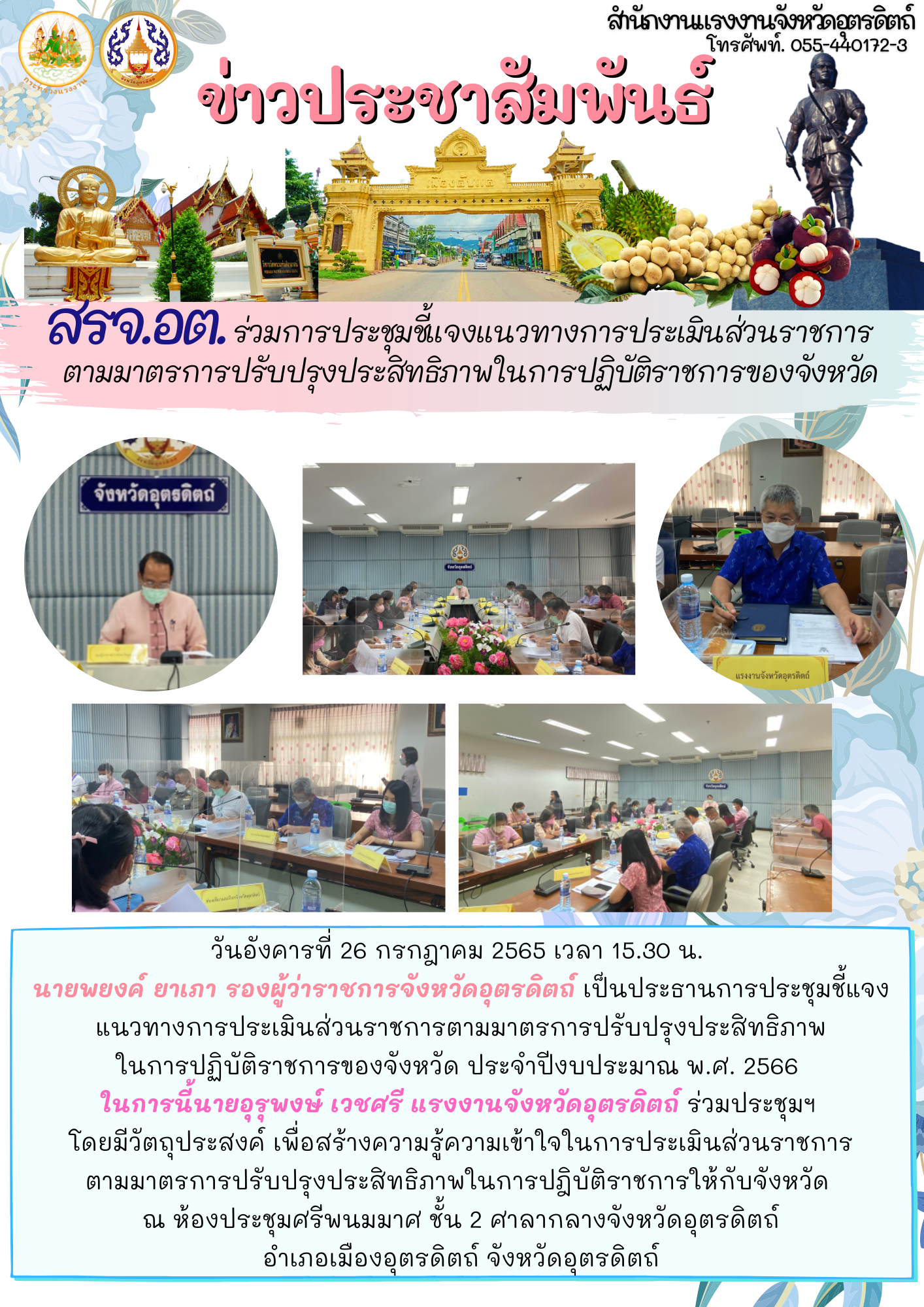 วันอังคารที่ 26 กรกฎาคม 2565 เวลา 15.30 น. นายพยงค์ ยาเภา รองผู้ว่าราชการจังหวัดอุตรดิตถ์ เป็นประธานการประชุมชี้แจงแนวทางการประเมินส่วนราชการตามมาตรการปรับปรุงประสิทธิภาพในการปฏิบัติราชการของจังหวัด ประจำปีงบประมาณ พ.ศ. 2566 ในการนี้นายอุรุพงษ์ เวชศรี แรงงานจังหวัดอุตรดิตถ์ ร่วมประชุมฯ โดยมีวัตถุประสงค์ เพื่อสร้างความรู้ความเข้าใจในการประเมินส่วนราชการตามมาตรการปรับปรุงประสิทธิภาพในการปฎิบัติราชการให้กับจังหวัด ณ ห้องประชุมศรีพนมมาศ ชั้น 2 ศาลากลางจังหวัดอุตรดิตถ์ อำเภอเมืองอุตรดิตถ์ จังหวัดอุตรดิตถ์