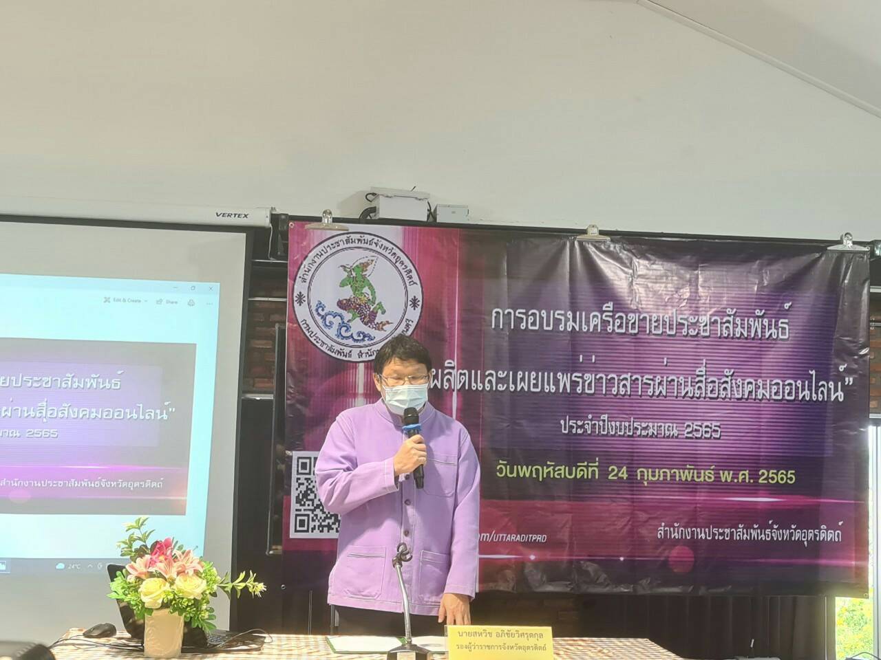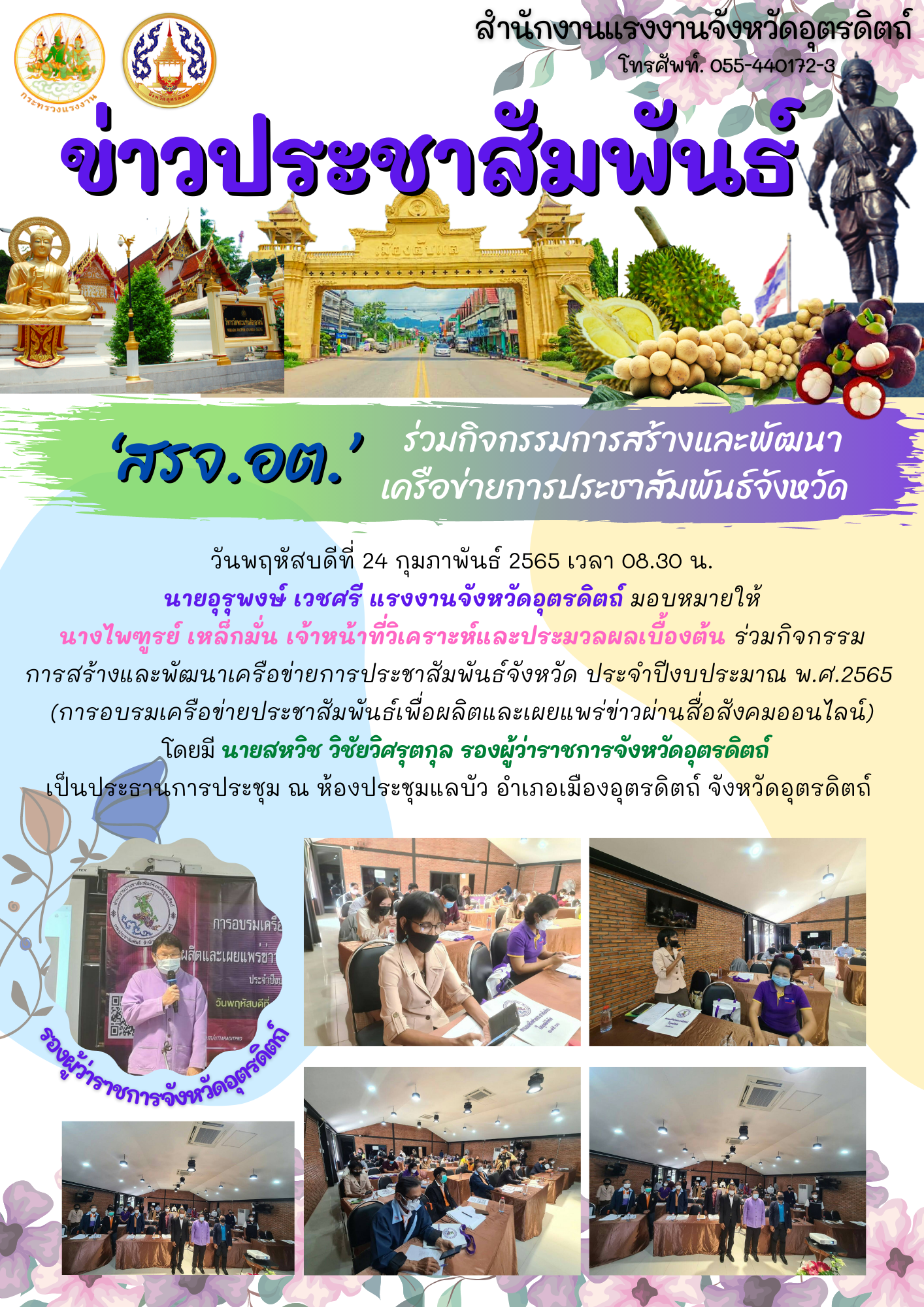วันพฤหัสบดีที่ 24 กุมภาพันธ์ 2565 เวลา 08.30 น. นายอุรุพงษ์ เวชศรี แรงงานจังหวัดอุตรดิตถ์ มอบหมายให้ นางไพฑูรย์ เหล็กมั่น เจ้าหน้าที่วิเคราะห์และประมวลผลเบื้องต้น ร่วมกิจกรรมการสร้างและพัฒนาเครือข่ายการประชาสัมพันธ์จังหวัด ประจำปีงบประมาณ พ.ศ.2565 (การอบรมเครือข่ายประชาสัมพันธ์เพื่อผลิตและเผยแพร่ข่าวผ่านสื่อสังคมออนไลน์) โดยมี นายสหวิช วิชัยวิศรุตกุล รองผู้ว่าราชการจังหวัดอุตรดิตถ์ เป็นประธานการประชุม ณ ห้องประชุมแลบัว อำเภอเมืองอุตรดิตถ์ จังหวัดอุตรดิตถ์